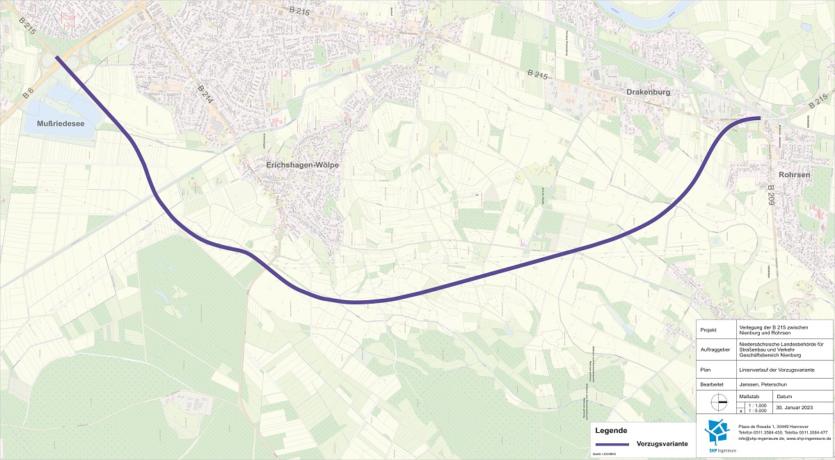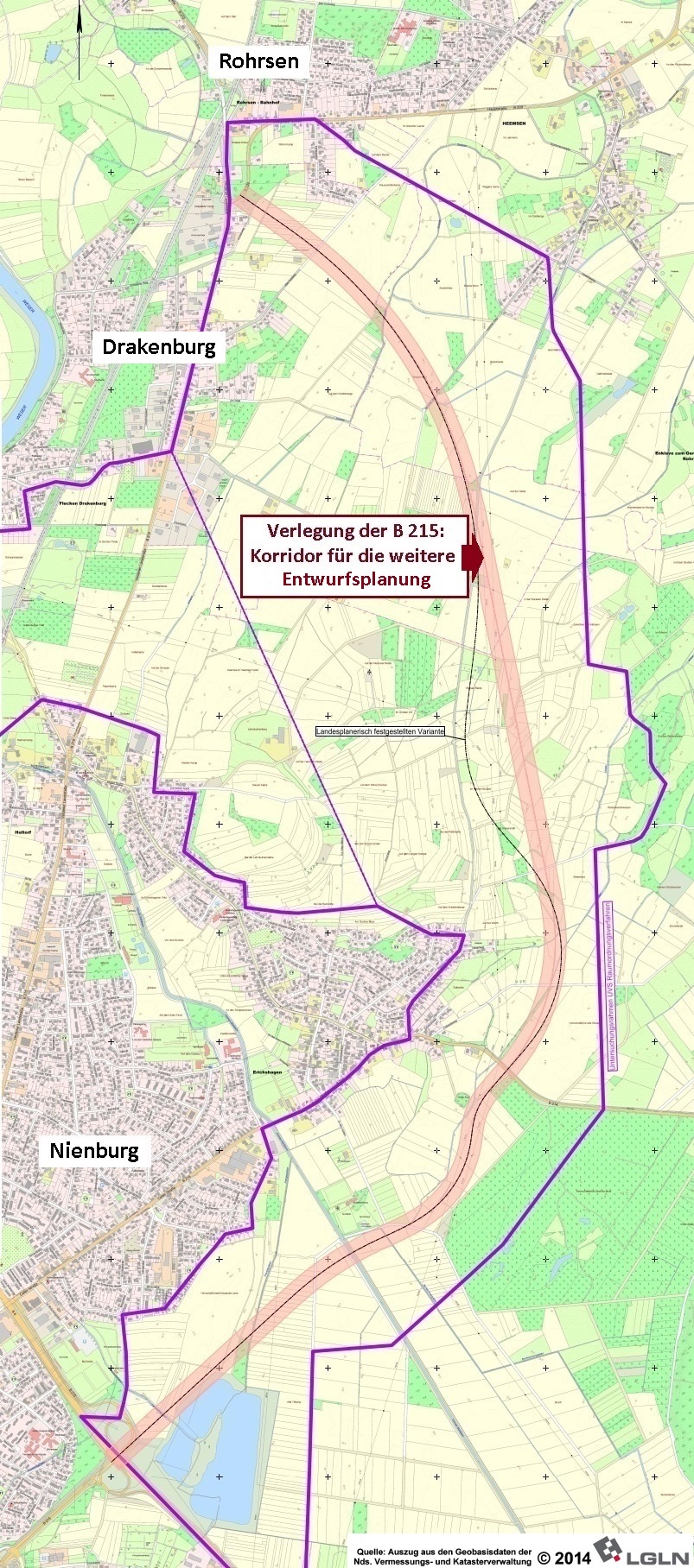 Juni 2023: Für die Verlegung der Bundestraße 215 zwischen Nienburg und Rohrsen liegt die Vorzugsvariante vor. Sie wird östlich der bisherigen Strecke verlaufen, um den innerstädtischen Bereich von Nienburg und Drakenburg vom Durchgangsverkehr zu entlasten.