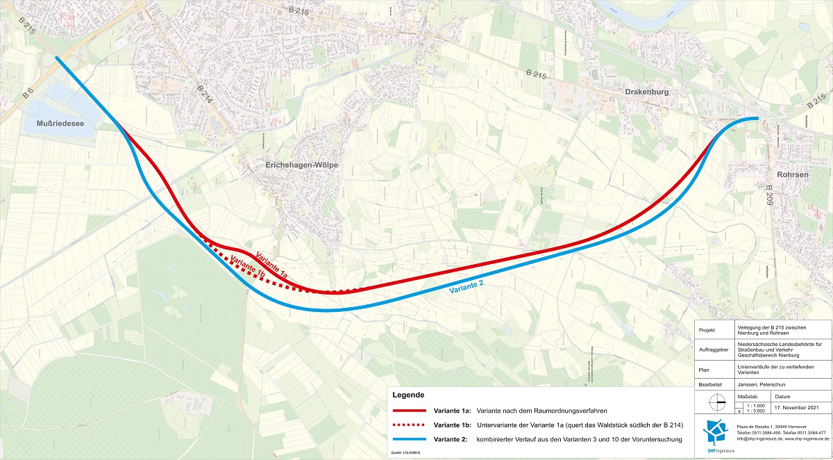 Juni 2023: Für die Verlegung der Bundestraße 215 zwischen Nienburg und Rohrsen liegt die Vorzugsvariante vor. Sie wird östlich der bisherigen Strecke verlaufen, um den innerstädtischen Bereich von Nienburg und Drakenburg vom Durchgangsverkehr zu entlasten.