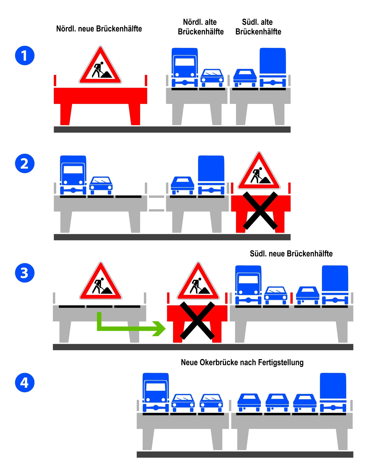 Nach Ende aller noch nötigen Arbeiten (u. a. Rückbau von Mittelstreifenüberfahrten) sollen auf der neuen Okerbrücke ab Ende August 2012 insgesamt sieben Fahrspuren den Verkehr der A 39 zwischen dem Dreieck und dem Kreuz Braunschweig-Süd abwickeln (Phase 4).