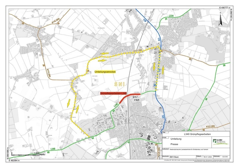 Ab Mittwoch, 21. Januar, wird ein Abschnitt der Siemensstraße (Landesstraße 340) im Bereich Gessel bei Syke (Landkreis Diepholz) für voraussichtlich etwa zwei Wochen voll gesperrt. Grund dafür sind Grünpflegearbeiten. Das teilt der Geschäftsbereich Nienburg der Niedersächsischen Landesbehörde für Straßenbau und Verkehr (NLStBV) mit.
