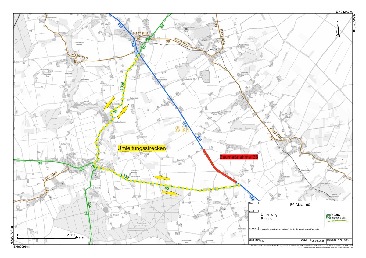 Dafür wird eine Vollsperrung der B 6 im Bereich Ochtmannien (ab dem Gasthaus Puvogel bis zum ehemaligen Gasthaus Kohlstedt / Ortsteil Harmissen) eingerichtet. Während der Vollsperrung leitet eine eingerichtete Umleitungsstrecke Verkehrsteilnehmer um die Baustelle herum (siehe Karte). Diese führt aus Richtung Süden kommend auf Höhe des Gasthauses Puvogel auf die Landesstraße 332 über Neubruchhausen auf die L 356 Richtung Heiligenfelde zurück auf die B 6. Aus Richtung Norden kommend führt sie in die entgegengesetzte Richtung.