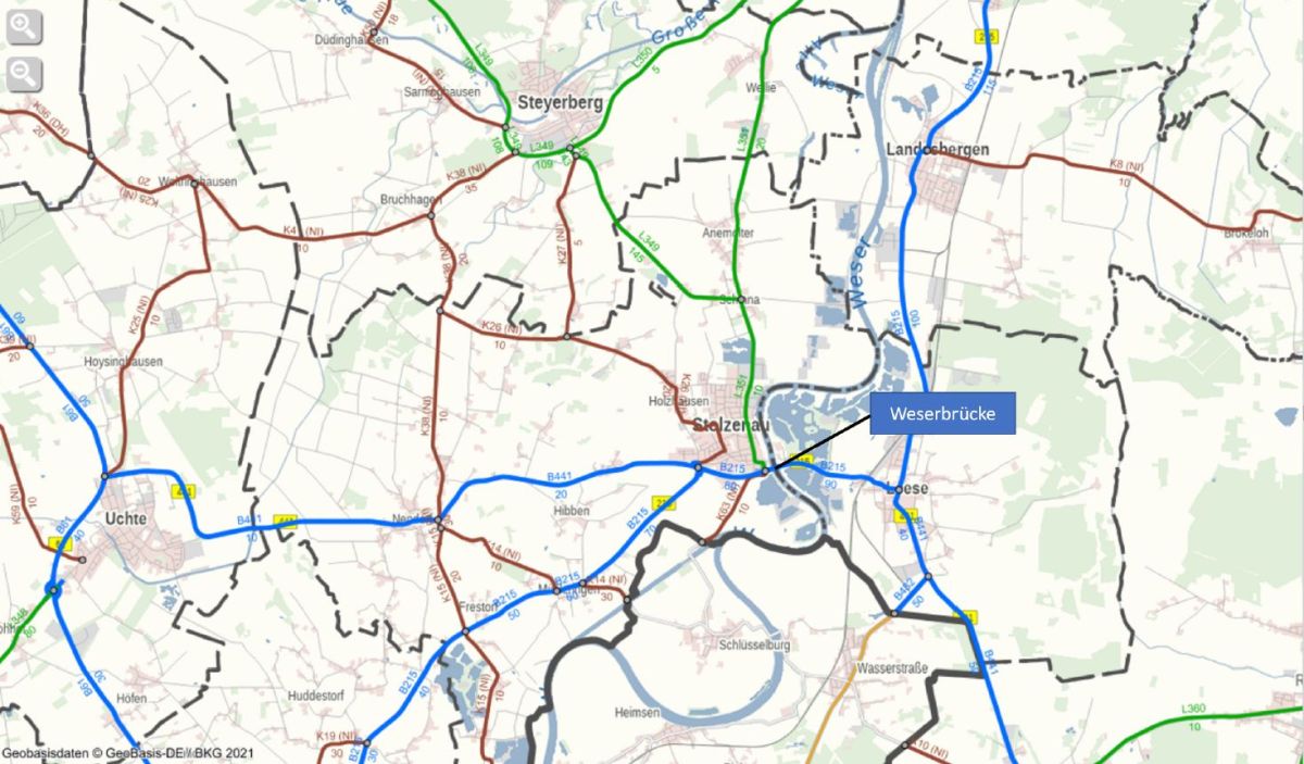 Das Brückenbauwerk unterführt den Wasserlauf der Weser im Zuge der B 215 südlich von Stolzenau (Landkreis Nienburg). Aufgrund von abnehmenden Tragfähigkeitsreserven ist das Bauwerk aus dem Jahr 1949 nicht geeignet, die zukünftigen Verkehrsbelastungen aufzunehmen und muss durch einen Neubau ersetzt werden.