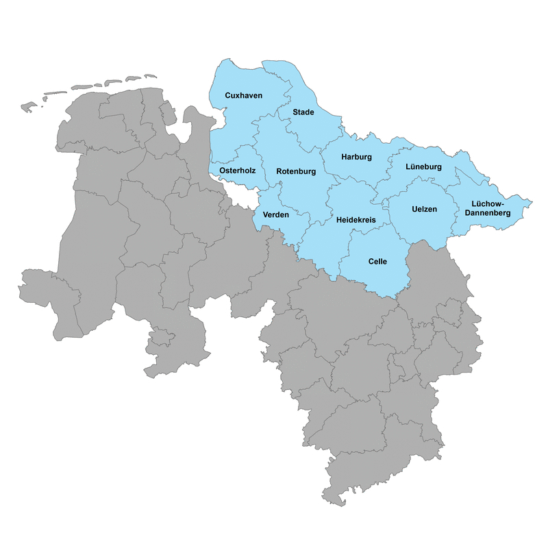 - die Landkreise Celle, Harburg, Heidekreis, Lüchow-Dannenberg, Lüneburg, Uelzen: