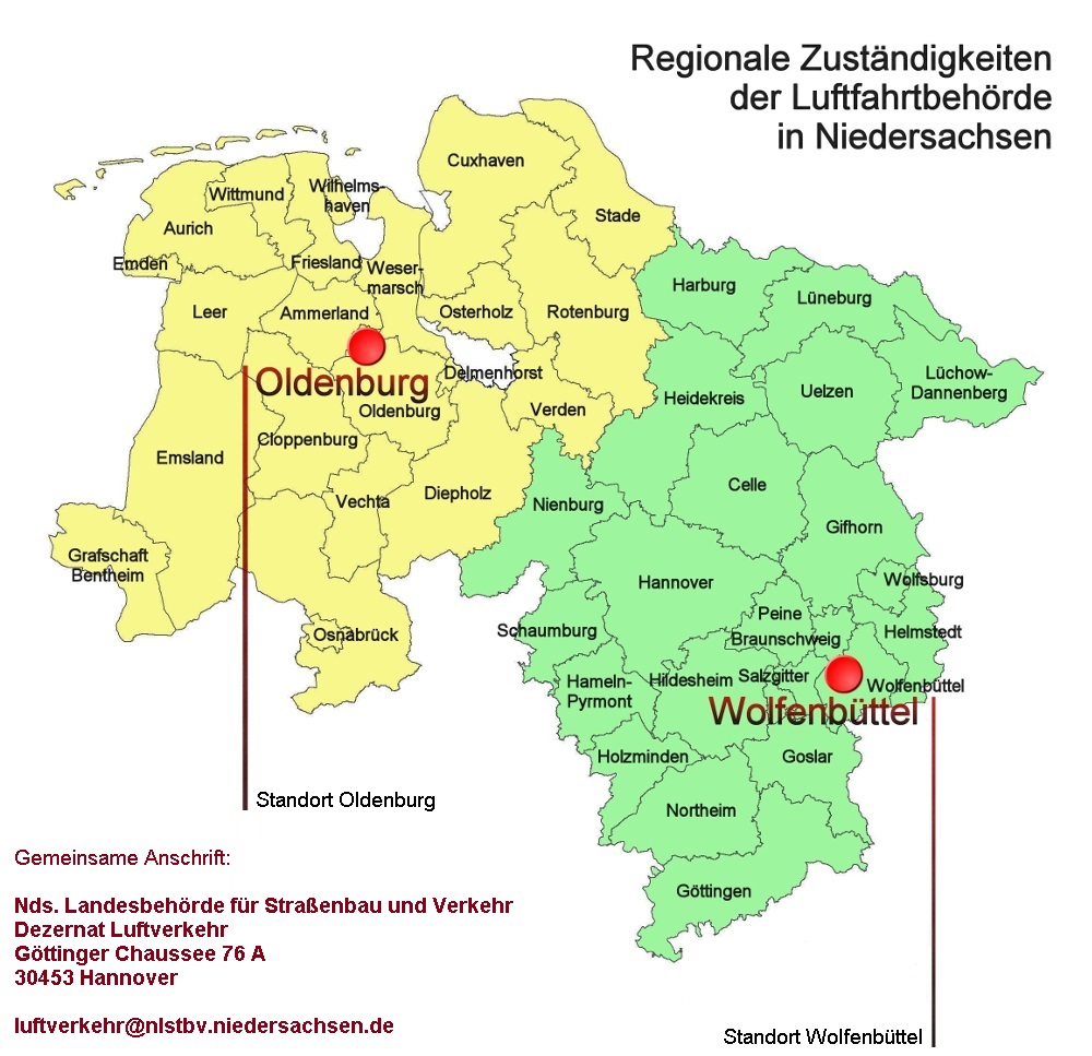 Für die Erteilung von luftrechtlichen Erlaubnissen ist die Landesluftfahrtbehörde Niedersachsen zuständig. Für die Nutzung des kontrollierten Luftraums (z. B. Flughäfen Hannover, Braunschweig, Bremen) ist eine Flugverkehrskontrollfreigabe der Deutschen Flugsicherung GmbH (DFS) erforderlich.