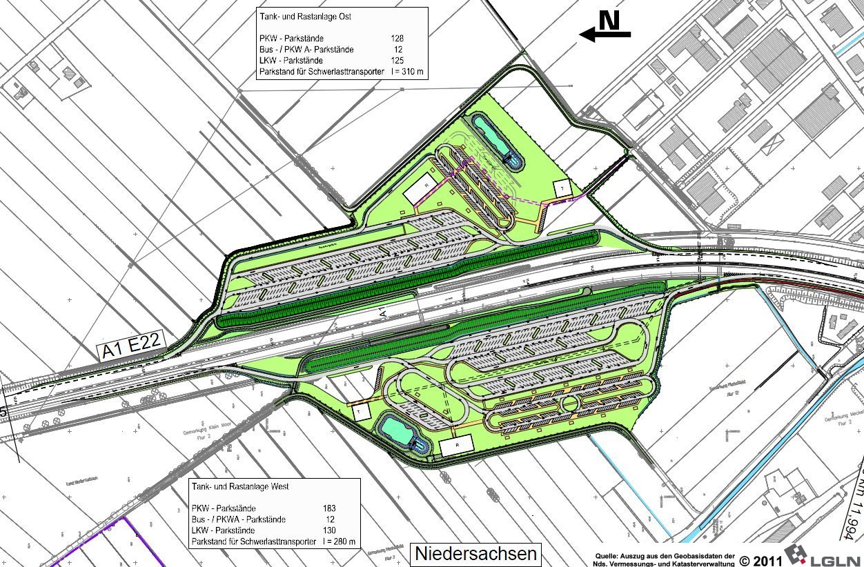 Die vorliegende Planung umfasst den Neubau der beidseitigen Tank- und Rastanlage an der A 1 zwischen km 10,585 und km 11,994 in der Gemeinde Seevetal, Ortsteil Meckelfeld, Gemarkungen Klein Moor und Meckelfeld, ca. 1 km südlich der Grenze zur Freien und Hansestadt Hamburg. Für Kompensationsmaßnahmen außerhalb des Trassenbereiches werden auch Flächen im Bereich der Gemeinde Seevetal, Ortsteil Meckelfeld, Gemarkung Over, in Anspruch genommen.