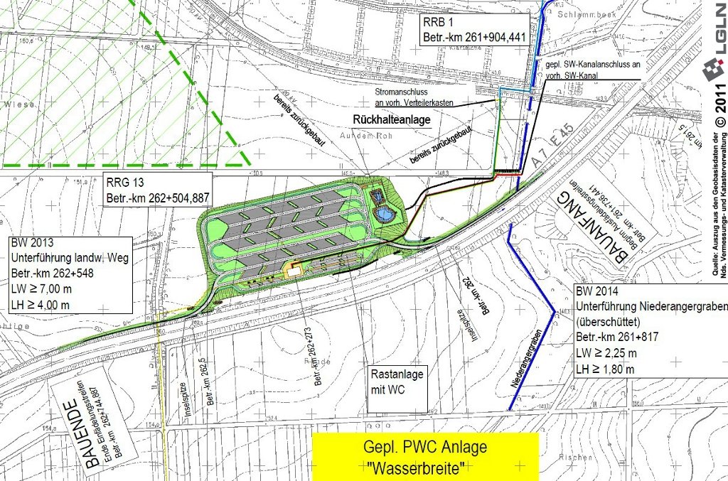Die Niedersächsische Landesbehörde für Straßenbau und Verkehr hat bis zur Übernahme durch die Autobahn GmbH des Bundes in ihrem Geschäftsbereich Gandersheim unter dem Namen "Wasserbreite" die Planungen für den Neubau einer PWC-Anlage (Parkplatz mit WC) an der A 7 nördlich der Ortschaft Holtensen (Stadt Göttingen) in Fahrtrichtung Kassel von Betr.-km 261+728 bis Betr.-km 262+745 in den Gemarkungen Bovenden und Lenglern, betrieben. Mit dem 1. Januar 2021 ist die Planungszuständigkeit auf die Autobahn GmbH des Bundes übergegangen.
