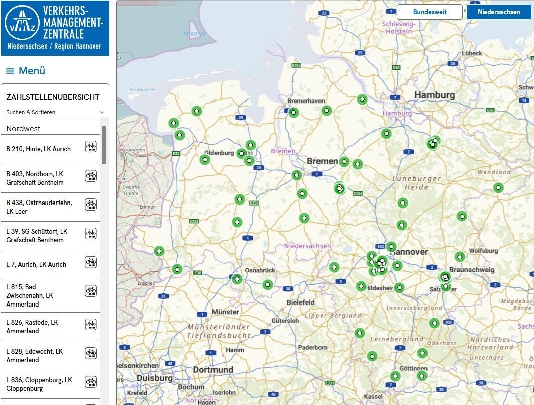 Die Daten der 39 Dauerzählstellen sind seit 2025 in der Verkehrsmanagementzentrale Niedersachsen / Region Hannover (VMZ) veröffentlicht. Dadurch wird eine landesweite, einheitliche, für die Öffentlichkeit und Verwaltung transparente und übersichtliche straßenbaulastträgerübergreifende Datenbasis auf einer Internetseite geschaffen, die für die Verkehrsplanung, für die Evaluation von Maßnahmen im Radverkehr und für Forschungszwecke genutzt werden kann.