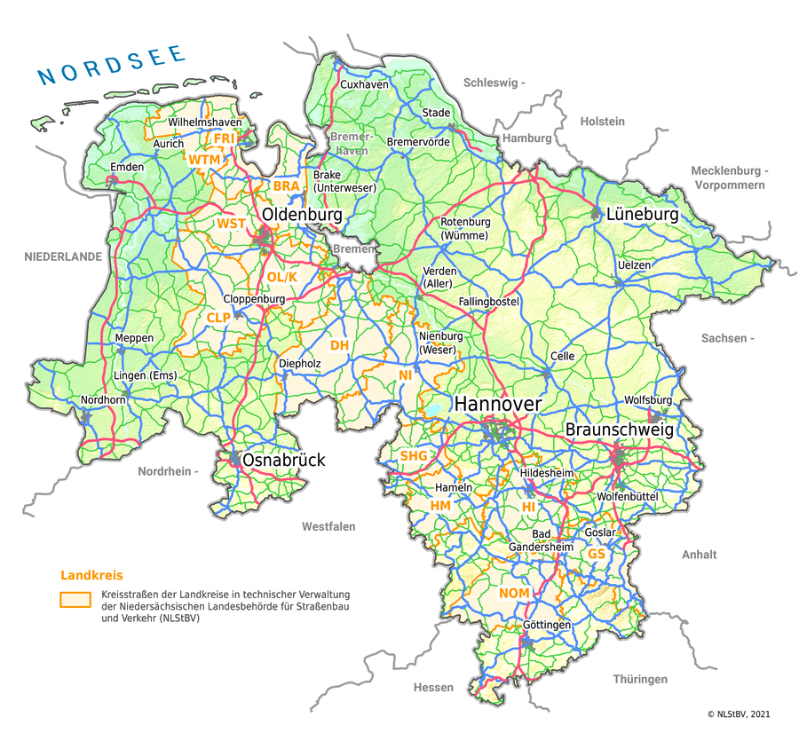 Für 13 Landkreise (Ammerland, Cloppenburg, Diepholz, Friesland, Goslar, Hameln-Pyrmont, Hildesheim, Nienburg/Weser, Northeim, Oldenburg, Schaumburg, Wesermarsch und Wittmund) betreut die Niedersächsische Landesbehörde für Straßenbau und Verkehr die Kreisstraßen; dies umfasst rund 3.590 km Straßen mit rund 1.671 km Radwegen.