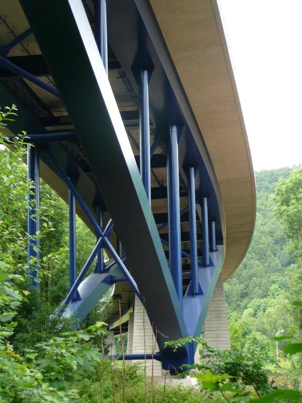 Im Zuge der B 243 überspannt die stählerne Halbbogenkonstruktion des Brückenbauwerks Lau 1 das Odertal im Südharz.