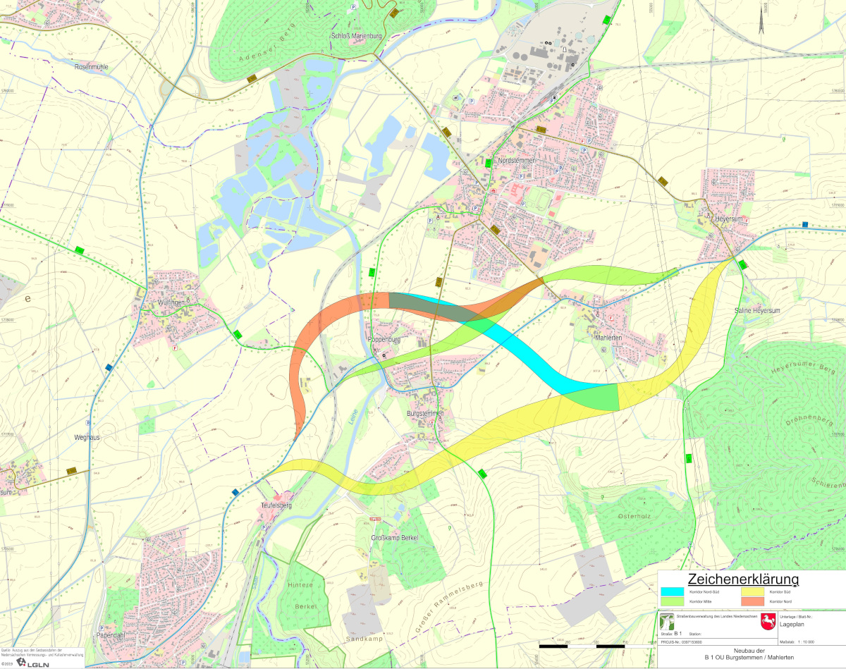 In einem ersten Schritt, der Vorplanung, wurden die Grundlagen für mögliche Linien des Trassenverlaufs in vier verschiedenen Korridoren ermittelt (siehe obenstehende Abbildung, Stand 22.02.2023). Diese wurden in einem Variantenvergleich gegenübergestellt, bei dem u. a. die Umweltauswirkungen mit zahlreichen Schutzgütern, landwirtschaftliche Betroffenheiten, wasserwirtschaftliche Belange, verkehrliche Wirkungen (Sicherheit und Leichtigkeit des Verkehrs), Lärm, städtebauliche Belange und Weiteres untersucht wurden. Diese Belange müssen mit allen anderen Aspekten in Einklang gebracht werden, so dass am Ende eine rechtssichere Planung entsteht. Erste Ergebnisse der verschiedenen Untersuchungen wurden der Öffentlichkeit bereits bei einer Informationsveranstaltung am 28. April 2022 in der Mehrzweckhalle in Burgstemmen vorgestellt. Die Nord-Süd-Variante wurde im Nachgang der Informationsveranstaltung als weitere mögliche Variante aufgenommen.
