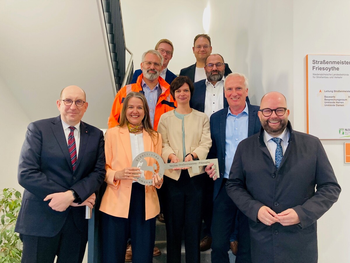 Mitte Juni 2025 wurde nach dem Umzug im April 2025 die offizielle Eröffnung des Neubaus gefeiert. Verena Pellmann vom Staatlichen Baumanagement überreichte Staatssekretär Matthias Wunderling-Weilbier vom Niedersächsischen Ministerium für Wirtschaft, Verkehr und Bauen und NLStBV-Präsident Timo Quander symbolisch den Schlüssel zu einer der modernsten Meistereien in ganz Niedersachsen.