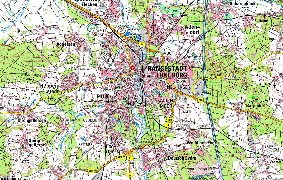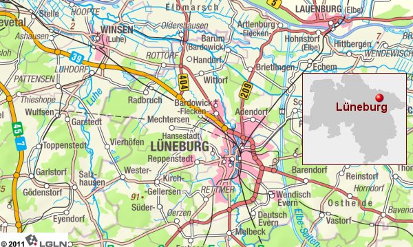 Die Hansestadt Lüneburg mit Lage des Dienstgebäudes Am Alten Eisenwerk 2 D (Kreis).