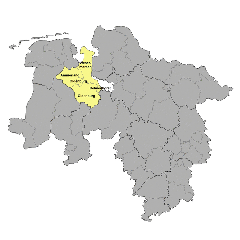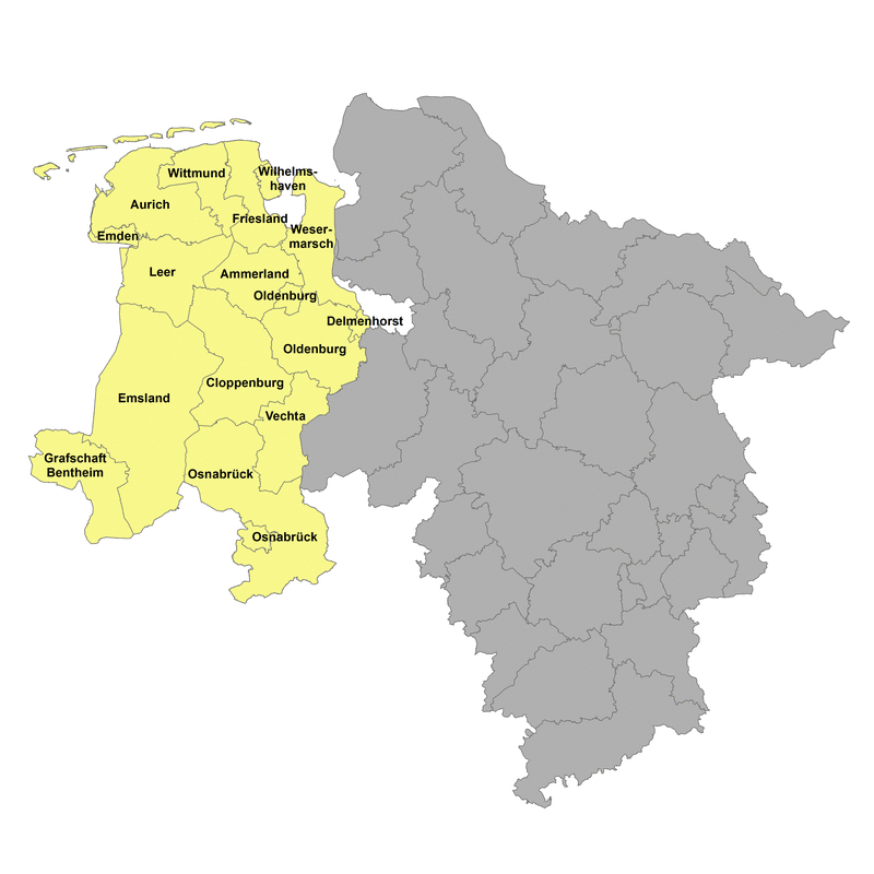 - Landkreise Ammerland, Aurich, Cloppenburg, Emsland, Friesland, Grafschaft Bentheim, Leer, Oldenburg, Osnabrück, Vechta, Wittmund