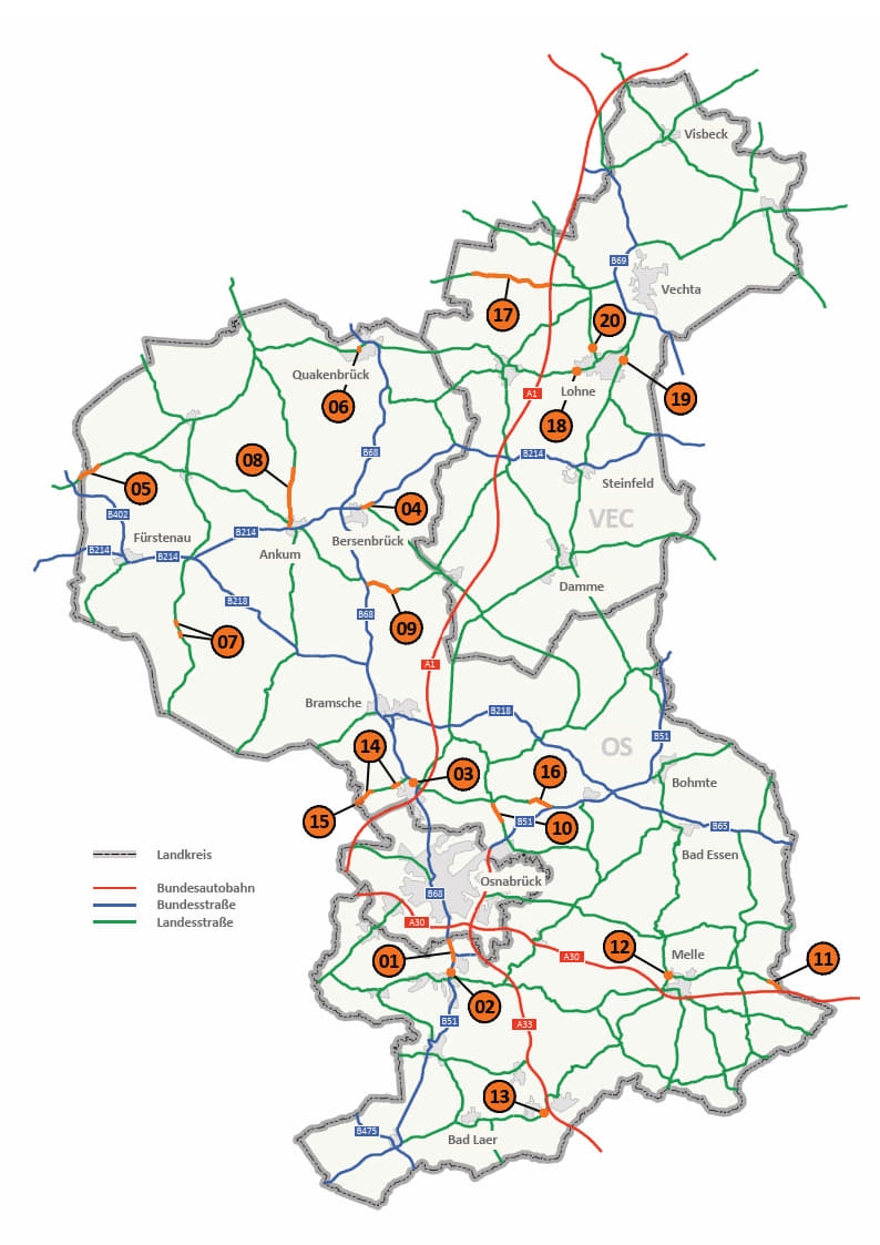 | 14 | L 109 | Neubau Bürgerradweg zwischen Wallenhorst-Hollage und Lotte-Halen und Fahrbahn- und Radwegsanierung auf einer Länge von 1,5 km zwischen Hollage und Wallenhorst |