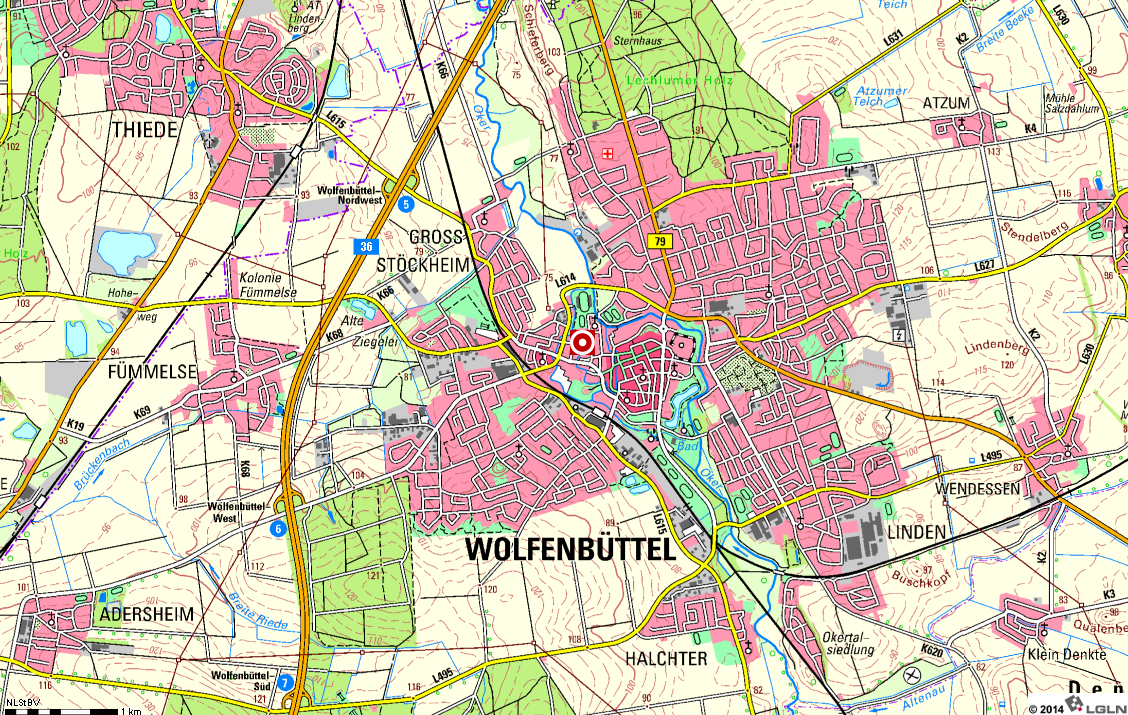 Die Stadt Wolfenbüttel mit Lage des Dienstgebäudes Sophienstraße 5 (Kreis).