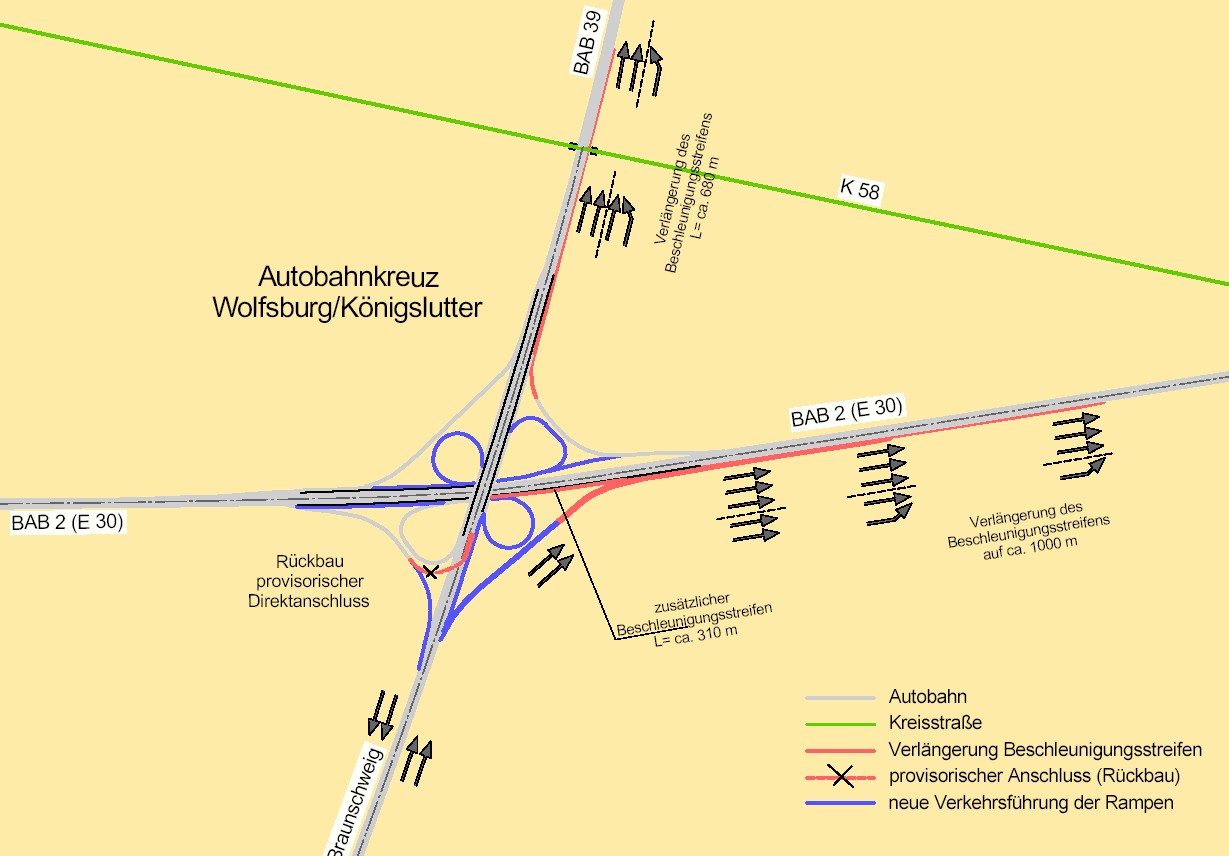 Der Lückenschluss zwischen der Autobahn 39 und der A 2 im Kreuz Wolfsburg/ Königslutter ist Ende Januar 2009 erfolgt. Dadurch verändern sich die Verkehrsströme in der Region. Der Fernverkehr zwischen den Richtungen Kassel/ Salzgitter und Berlin/ Wolfsburg wird künftig über die Autobahn 39 (Südtangente Braunschweig) und das Autobahnkreuz zur A 2 geleitet und nicht wie bisher über die weniger leistungsfähige A 391 (Westtangente Braunschweig). Diese neuen Verkehrsbeziehungen erfordern eine Ertüchtigung des Autobahnkreuzes Wolfsburg/ Königslutter. Die Maßnahmen im Einzelnen: