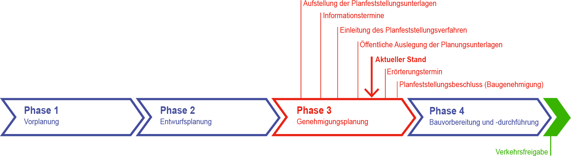 Nach dem vorgelagerten Raumordnungsverfahren und der Linienbestimmung durch das Bundesverkehrsministerium wurde die Planung im Rahmen des Vorentwurfsstadium (Phase 2 der unten stehenden Abbildung) konkretisiert. Mit dem „Gesehen-Vermerk“ im September 2016 wurde die Zustimmung des Bundesverkehrsministerium zum Entwurf erteilt. Das Planfeststellungsverfahren (Genehmigungsverfahren) wurde am 1. Dezember 2017 eingeleitet.