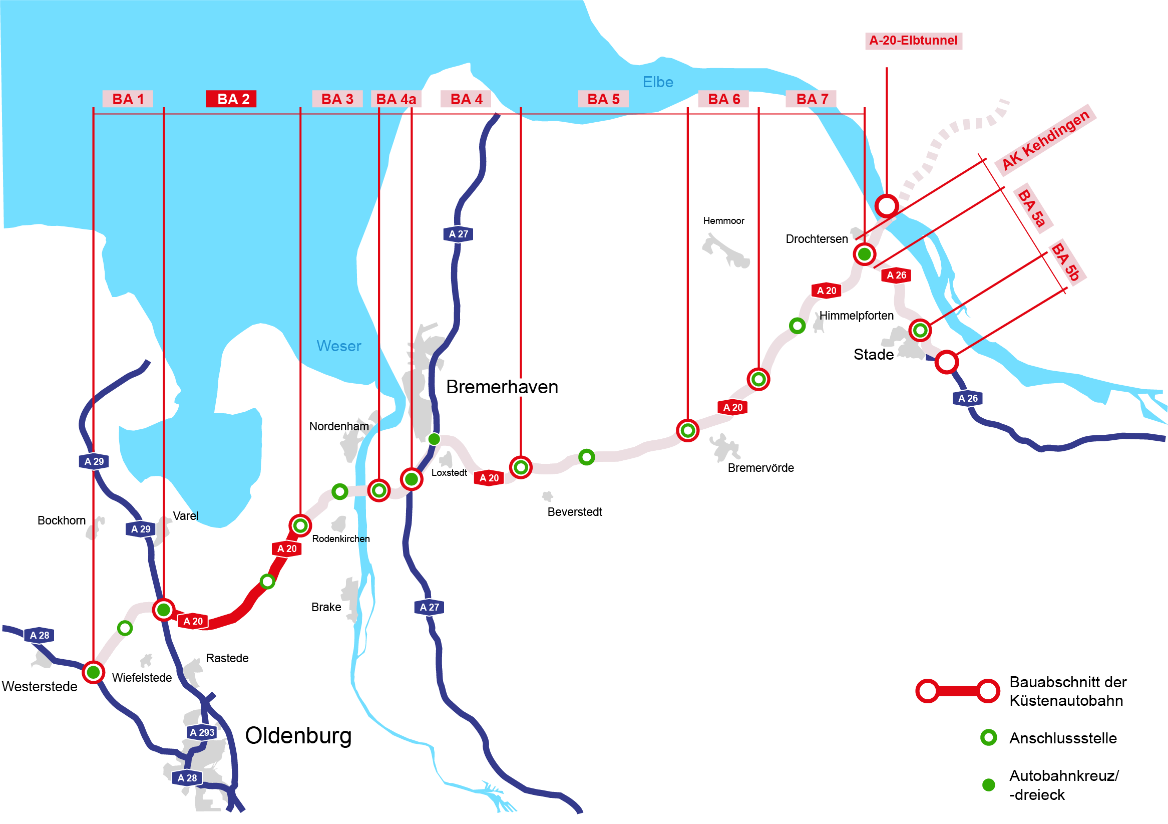 Westlich der Jade verläuft die spätere A 20 durch die Wesermarsch. Aufgrund des im Boden anstehenden Torfes ist der Straßenbau ohne weitere baugrundverbessernde Maßnahmen nicht möglich. In diesem Bereich wird wie auch in den Nachbarabschnitten in der Elbmarsch und der A 26 das sogenannte Vorbelastungsverfahren verwendet.