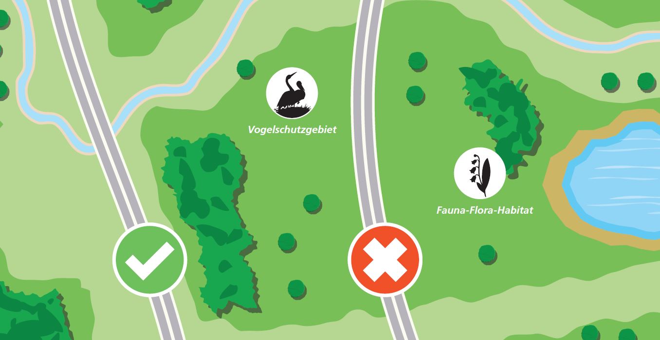 FFH- & Vogelschutzgebiete sind sehr streng geschützt. Schädigungen sind nur in besonderen Ausnahmefällen möglich. Bereits bei dem Verdacht, dass ein Bauvorhaben die Ziele der Schutzgebiete erheblich beeinträchtigen könnte, sieht die Naturschutzgesetzgebung sog. FFH-Verträglichkeitsprüfungen vor. Nur wenn die Nachteile nicht zu vermeiden sind und keine zumutbaren Alternativen vorliegen, können unter Auflagen Ausnahmen erteilt werden. Dazu sind geeignete Maßnahmen für die betroffenen Schutzgebiete im zeitlich-funktionalen Zusammenhang festzulegen.