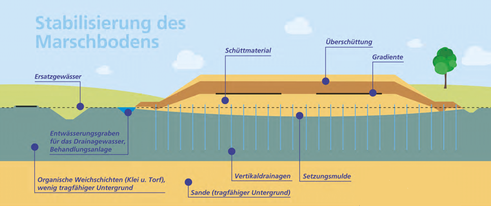 Hierbei wird der weiche, nicht tragfähige Untergrund durch eine schichtweise erfolgende Sandüberschüttung belastet und die sich ergebenden Setzungen vor dem Straßenbau und der Verkehrsfreigabe vorweggenommen. Gleichzeitig wird das austretende Porenwasser aufgenommen und in separaten Entwässerungsgräben aufgefangen. Dieses oft eisenhaltige Wasser wird in sogenannten Porenwasserbehandlungsanlagen geführt, in denen der Eisenanteil ausfällt. Das so gereinigte Wasser wird erst dann in die bestehenden Vorfluter eingeleitet.