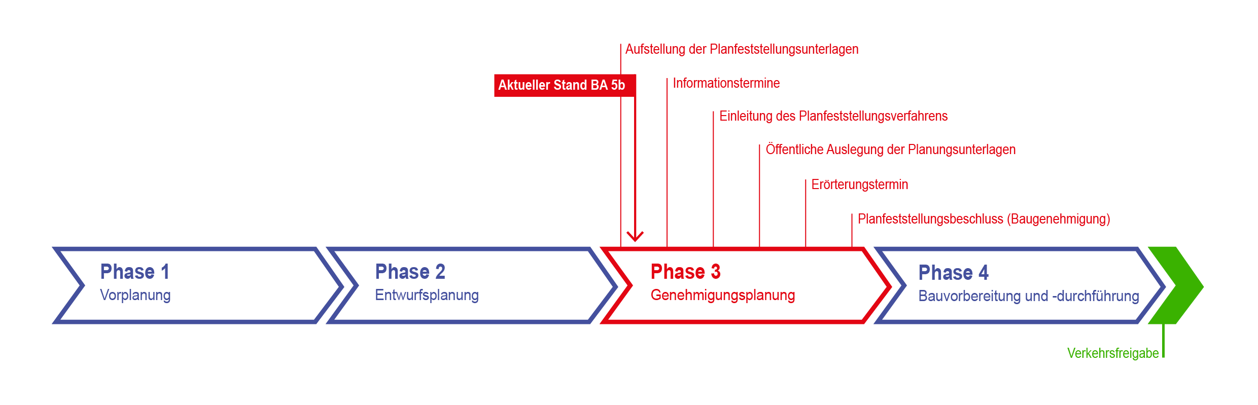 Während im Abschnitt 5a am 26. Februar 2019 das Planfeststellungsverfahren eingeleitet wurde, muss der Abschnitt 5b zunächst zur Genehmigung beim Bundesministerium für Verkehr und digitale Infrastruktur (BMVI) vorgelegt werden. Derzeit erfolgt die Erstellung dieser Vorentwurfsunterlage. Nachdem das BMVI der Planunterlage zugestimmt hat, wird der Feststellungsentwurf für das Planfeststellungsverfahren erarbeitet. Beachten Sie hierzu die aktuelle Planungsgebietsverordnung.