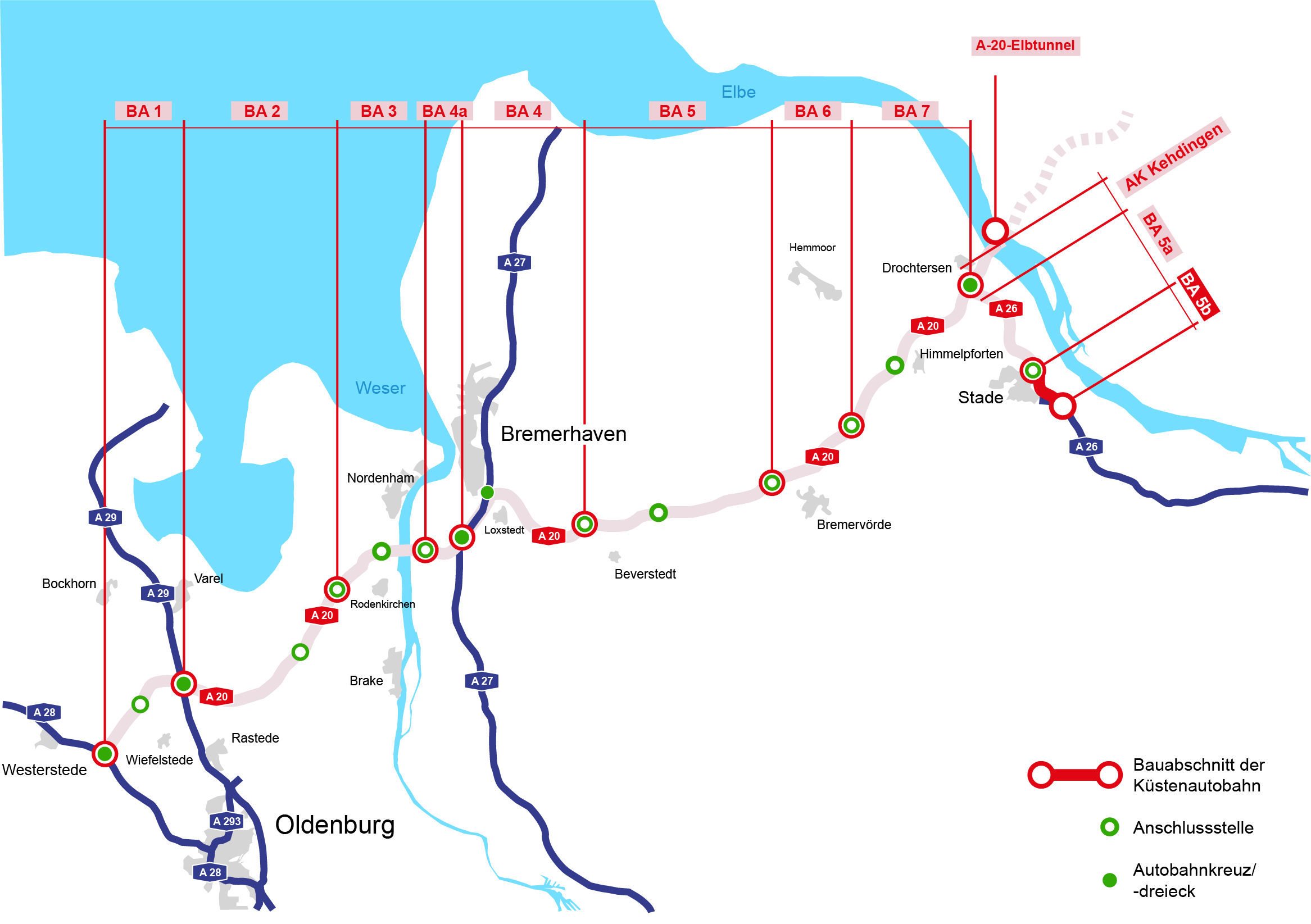 Der Abschnitt 5b zwischen der Anschlussstelle an der Freiburger Straße/ L 111 und der Anschlussstelle Stade-Ost wird die Lücke zwischen dem von dem Autobahnkreuz A 20/ A 26 kommenden Abschnitt 5a und dem bereits fertiggestellten Abschnitt 1 schließen.