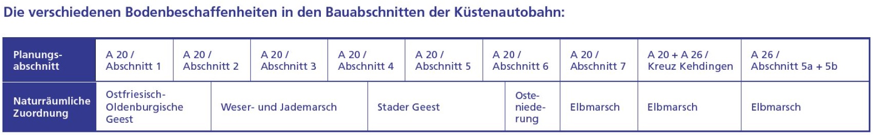 In Zuge des Trassenverlaufs der A 20 gibt es unterschiedliche Böden. Dieses sind von West nach Ost betrachtet die Ostfriesisch-Oldenburgische Geest, die Jade-/Wesermarsch, die Stader Geest und die Elbmarsch.
