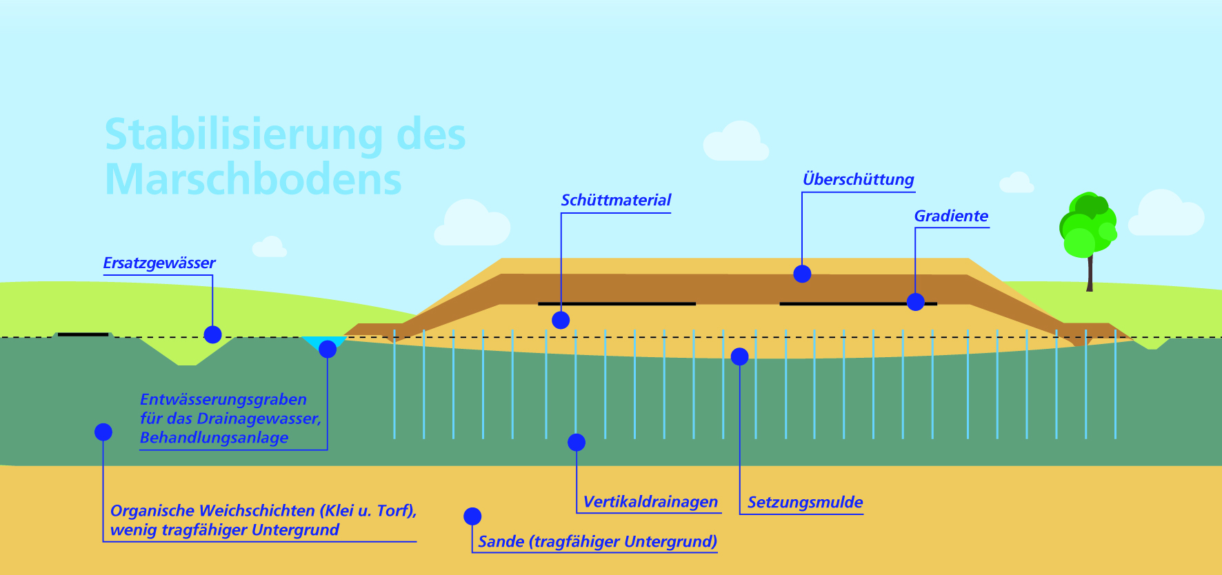 Der Marschboden ist vergleichbar mit einem mit Wasser vollgesogenen Schwamm. Um den Boden zu verdichten und damit zu konsolidieren, wird das Wasser herausgepresst, indem Gewicht - in Form von Sand - auf dem Boden aufgebracht wird. Um diesen Vorgang zu beschleunigen, werden Drainagen eingebracht. Wie durch Strohhalme kann das herausgepresste Wasser dadurch kontrolliert abfließen. Es wird dann in einem Ersatzgewässer zwischengespeichert, gereinigt, und anschließend dem normalen Wasserkreislauf zugeführt.