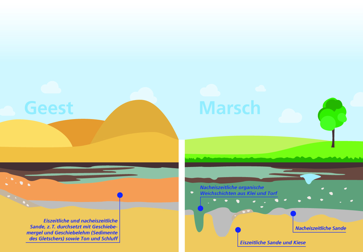 Diese Bodentypen unterscheiden sich grundlegend in ihrer Beschaffenheit. Die Geest liegt meist deutlich höher und zeichnet sich durch sandige Böden aus. Die Marsch hingegen ist meist flach und feucht.