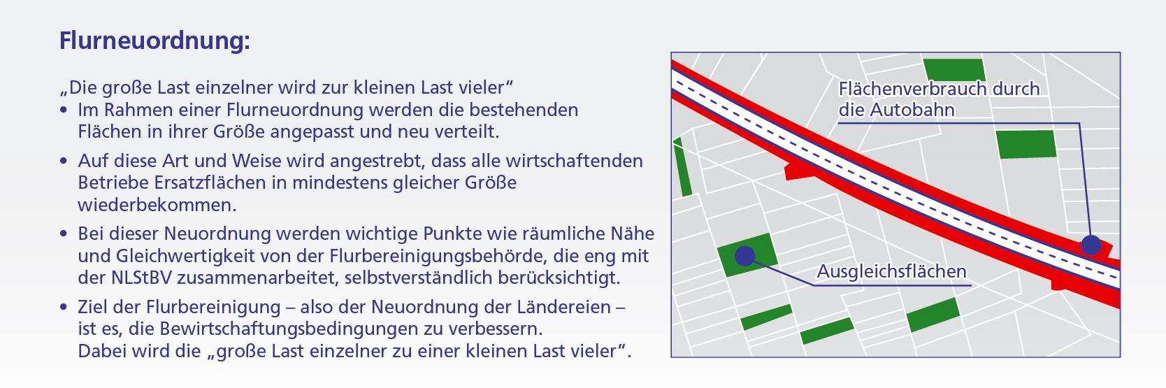 Die Zuteilung von Ersatzflächen, die ebenfalls von der Straßenbaubehörde erworben werden müssen, erfolgt in den allermeisten Fällen im Rahmen eines sogenannten Flurbereinigungsverfahrens. Das Flurbereinigungsverfahren wird durch die Flurbereinigungsbehörde – in Niedersachsen die Ämter für regionale Landesentwicklung, kurz ArL – in enger Zusammenarbeit mit der NLStBV durchgeführt. Im Rahmen einer Flurneuordnung werden die Restflächen von Flurstücken und zugekaufte Ersatzflächen in ihrer Größe angepasst und neu verteilt. Die Last, die durch den Entzug der Autobahnflächen entsteht, wird so auf viele Schultern verteilt. Es wird angestrebt, dass alle Eigentümer Ersatzflächen in mindestens gleicher Größe wie die in Anspruch genommenen Flächen erhalten. Dieses Ziel konnte bisher in Niedersachsen immer erreicht werden.