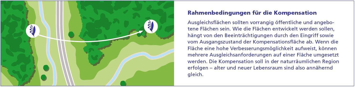 Die Festlegung, welche Art von Ausgleichsmaßnahme geplant wird, hängt davon ab, in welcher Art und Weise der Naturhaushalt oder das Landschaftsbild durch den Autobahnbau beeinträchtigt werden. Grundsätzlich gilt, dass die Ausgleichsmaßnahmen, das, was verloren geht, möglichst in gleichartiger Art wiederherstellen sollen. Neben diesem „Funktionsbezug“ spielt die Verfügbarkeit der Fläche eine wichtige Rolle. Vorrangig sollen, wenn möglich, öffentliche Flächen oder freiwillig zu erwerbende Flächen verwandt werden. Wie weit die Maßnahmenfläche von dem Eingriffsort entfernt liegen darf, hängt z. B. davon ab, für welche Tierart die Maßnahme erforderlich wird.