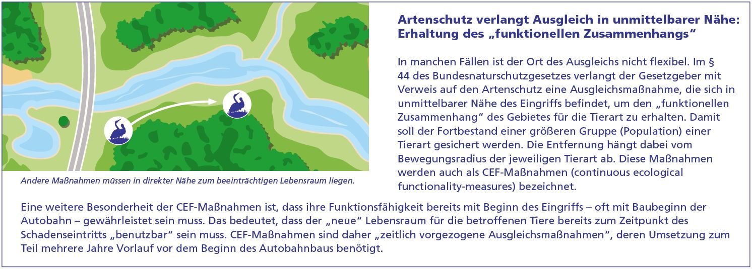 Für gesetzlich besonders geschützte Arten schreibt der Gesetzgeber in § 44 des Bundesnaturschutzgesetzes sogenannte CEF-Maßnahmen vor (continuous ecological functionality-measures). Um zum Beispiel die Population einer Tierart zu erhalten, muss sie den neuen Lebensraum gut erreichen können. Dieser muss also im natürlichen Bewegungsradius der Tierart liegen.