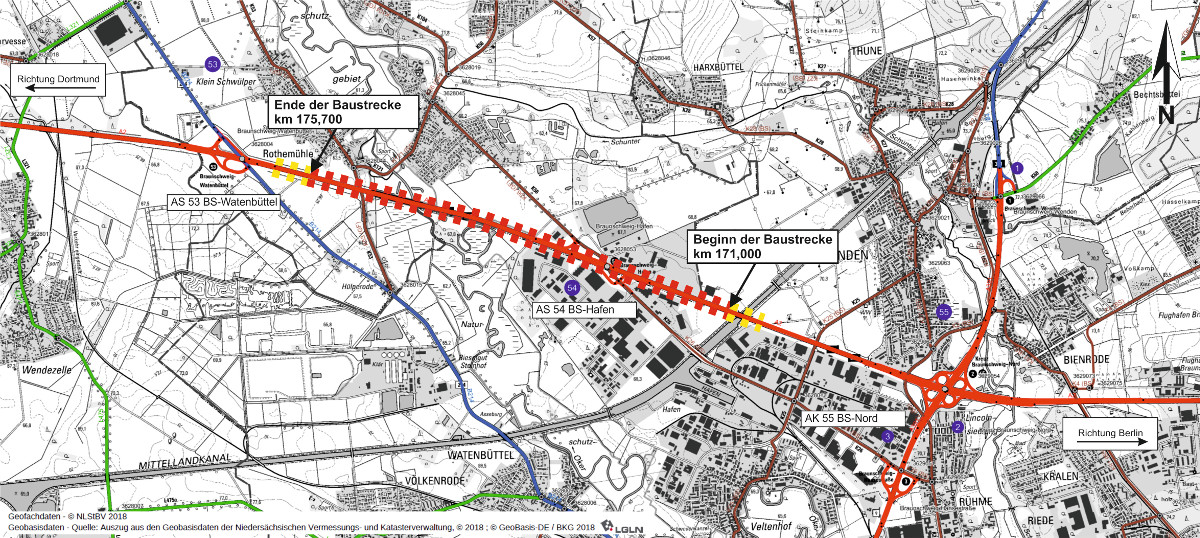 Die Bautätigkeiten beginnen in Fahrtrichtung Dortmund 1,5 km vor der Anschlussstelle (AS) Braunschweig-Hafen und enden im Westen unmittelbar vor der AS Braunschweig-Watenbüttel. Die Baustellenverkehrsführung beginnt unmittelbar vor dem jeweiligen Beginn und Ende der Baumaßnahme. Innerhalb des Streckenabschnittes befindet sich die Anschlussstelle Braunschweig-Hafen.