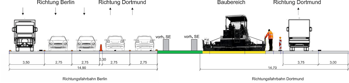 In Fahrtrichtung Berlin und Dortmund stehen jeweils drei Fahrspuren zur Verfügung. Dazu ist es erforderlich, zwei Fahrspuren in Fahrtrichtung Dortmund auf die Gegenfahrbahn überzuleiten und mittels einer transportablen Schutzeinrichtung vom durchgehenden Verkehr in Richtung Berlin zu trennen. Der Hauptfahrstreifen in Richtung Dortmund verbleibt auf der Richtungsfahrbahn Dortmund und wird in mindestens 5,50 m Breite mit Baken vom Baufeld abgetrennt, um die erforderliche Durchfahrtsbreite für Schwertransporte auch während der Bautätigkeiten sicherzustellen. Die Geschwindigkeit für die drei Fahrstreifen Richtung Berlin und den zwei übergeleiteten Fahrstreifen auf der Richtungsfahrbahn Berlin beträgt 80 km/h. Die Geschwindigkeit für die Fahrspur durch das Baufeld und der Überleitungsbereiche im Zulaufbereich der Baustelle beträgt 60 km/h. Da sich das Baufeld auf der Richtungsfahrbahn Dortmund im Grenzbereich zum Straßenverkehr befindet, ist diese Fahrspur mit 60 km/h beschildert, um den Gesundheits-, Arbeits- und Unfallschutz der Arbeitskräfte zu gewährleisten. Sowohl von Osten als auch von Westen kommend ist im Zuflussbereich auf die geänderte Baustellenverkehrsführung und die Überleitung ein Geschwindigkeitstrichter von 120 km/h auf 60 km/h eingerichtet.