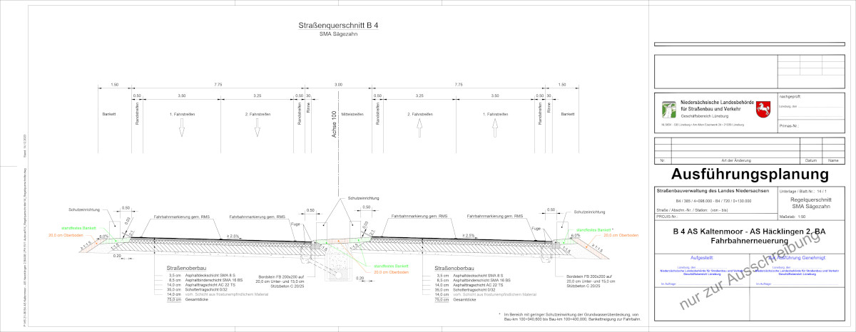 Die Arbeiten zur Grunderneuerung der B 4 zwischen den Anschlussstellen Häcklingen und Kaltenmoor sind Anfang April 2024 gestartet. Die Baumaßnahme verzögert sich zur Zeit auf Grund eines mangelhaften Baustoffgemisches für Schottertragschichten (siehe auch Presseinformation vom 21.03.2024). Die Maßnahme schreitet gut voran und liegt im Zeitplan.