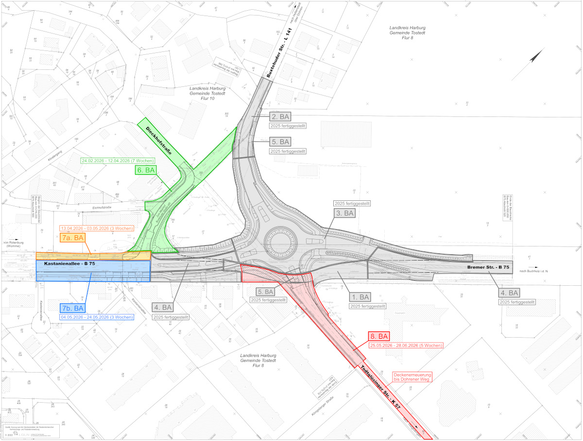 In den Jahren 2023 und 2024 ist die Ortsdurchfahrt Tostedt (Landkreis Harburg) erneuert worden. Nun steht in diesem Bereich ein weiteres Bauprojekt an: Die B 75 wird mit der Buxtehuder Straße (L 141) und Todtglüsinger Straße (K 57) in einem Kreisverkehr zusammengeführt. Ab 4. Juni 2025 starten die entsprechenden Arbeiten, die rund ein Jahr dauern sollen.