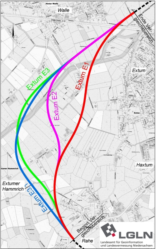 Um für den Bereich Extum eine optimierte Linienführung der neuen B 210 zu finden, wurde die landesplanerisch festgestellte und linienbestimmte Trasse stadtferner verlaufenden Linienführungen gegenübergestellt.