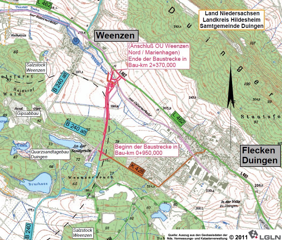Die Niedersächsische Landesbehörde für Straßenbau und Verkehr plant den Ausbau der Bundesstraße 240 bei Weenzen (Südteil) von der Kreisstraße 428 bis zur Landesstraße 462 im Rahmen einer Gesamtplanung für die B 240 zwischen Holzminden und Hannover zur Verbesserung des Verkehrsflusses zwischen der Region Hannover und den Landkreisen Holzminden und Hildesheim. Der rund 23 km lange Streckenabschnitt der B 240 zwischen Eschershausen und Gronau beinhaltet insgesamt sechs Planungsabschnitte.