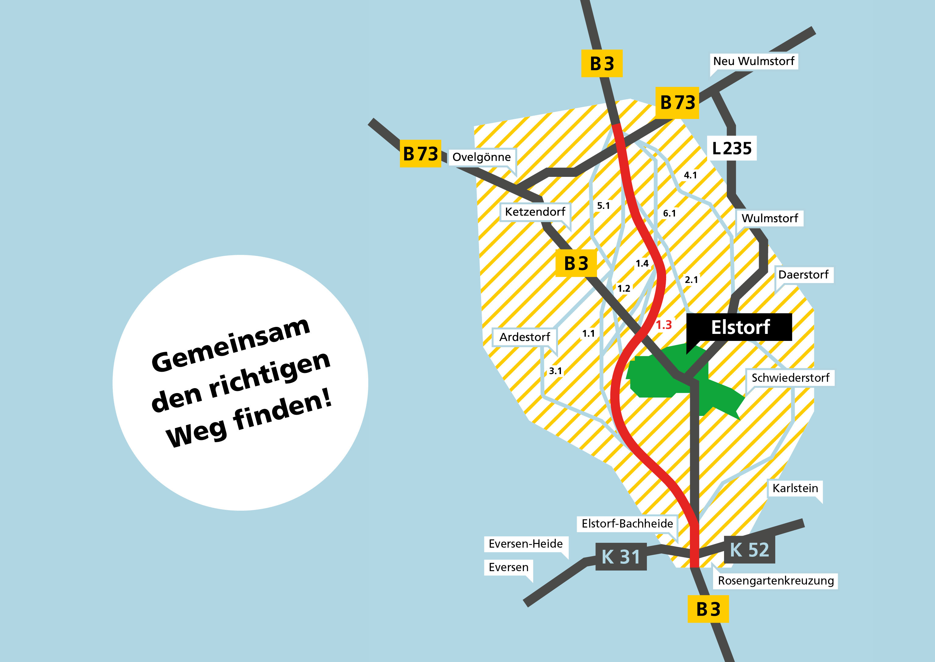 Der 2. Bauabschnitt der B 3n (westlich Neu Wulmstorf bis nördlich Elstorf) wurde bisher vom regionalen Geschäftsbereich Stade geplant. Im Zuge der Variantenuntersuchungen zum 2. Bauabschnitt hat sich gezeigt, dass durch die Festlegungen einer Linienführung ggf. eine Vorfestlegung für die Weiterführung in den 3. Bauabschnitt der B 3n (nördlich bis südlich Elstorf) erfolgen würde. Daher ist nur eine gemeinsame Planung des 2. und 3. Bauabschnittes der B 3n zielführend.