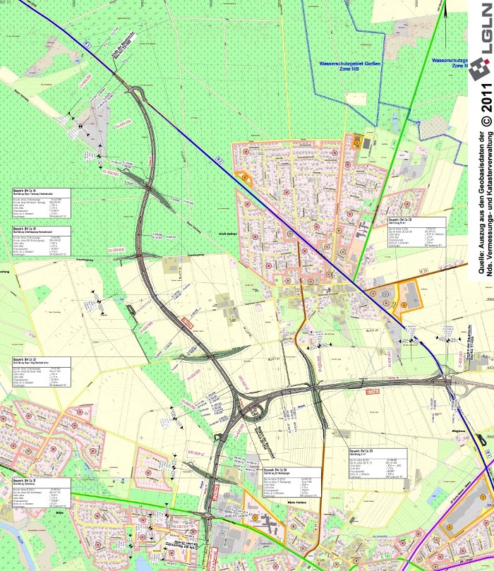 - 21.03.2012: Zweite Arbeitskreissitzung. In dieser Sitzung wurde ein Vergleich verschiedener Achsvarianten im westlichen Bereich von Groß Hehlen vorgestellt; siehe hierzu nebenstehenden Vergleich vom 27.02.2012 und den Übersichtslageplan mit der favorisierten Achse 21.