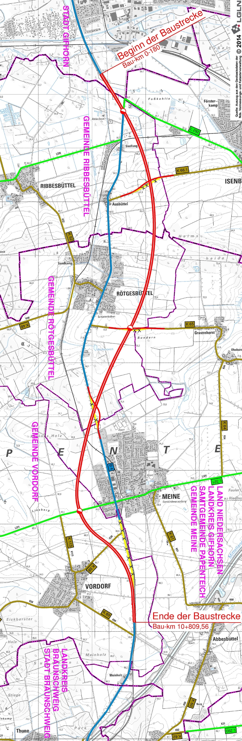 Das Projekt der rund 11km langen und voraussichtlich etwa 150 Millionen Euro teuren Ortsumgehungen Rötgesbüttel und Meine befindet sich seit 2016 im Planfeststellungsverfahren.