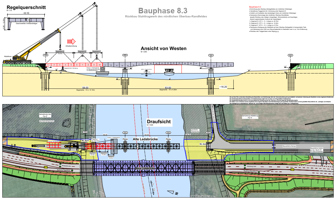 Für den Rückbau der temporär gestützten Seitenfelder werden beidseitig Pontons mit Traggerüsttürmen unter das jeweilige Seitenfeld eingeschwommen. Um Schwankungen des Wasserspiegels im Abbruchprozess zu minimieren, wird vorweg eine möglichst hohe Stauhöhe der Leda angestrebt.
