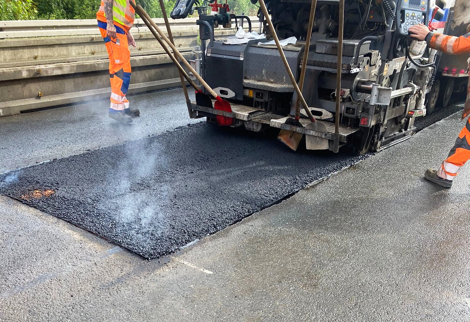 Ein Ende ist übrigens auch für einen ganz speziellen Bereich in Sicht: Ein Teil des Fahrbahnbelags auf der Südschnellwegtrasse, die noch unter Verkehr ist. Mehrere zehntausend Fahrzeuge rollen über diese beiden Fahrbahnen. Jeden Tag, und das seit rund 440 Tagen (Stand heute). Ganz schön viel Last auf einer ganz schön kleinen Fläche. Deswegen eilen wir der Strecke zu Hilfe und setzen sie an einigen Stellen instand. Schließlich müssen wir sie noch weiter nutzen.