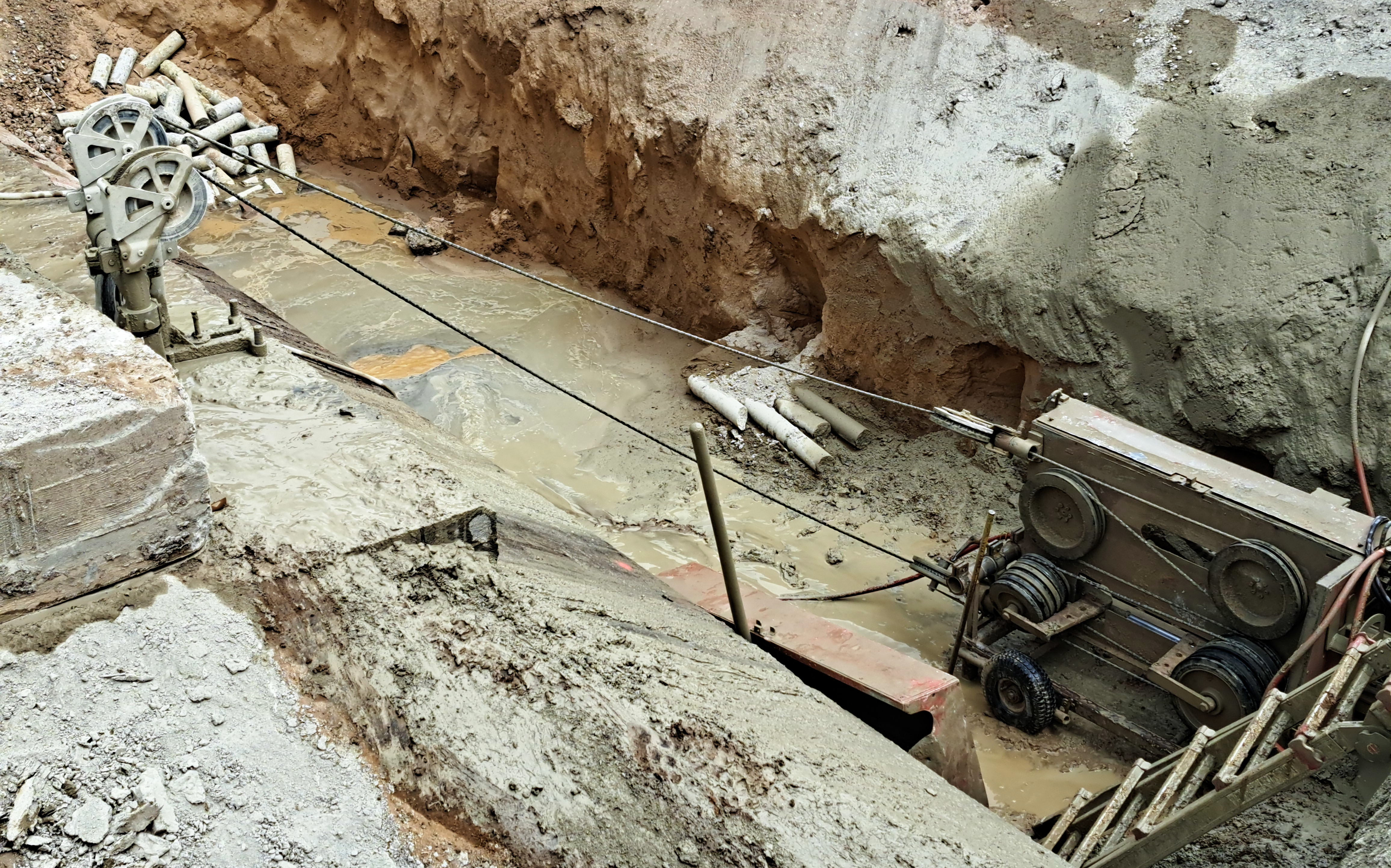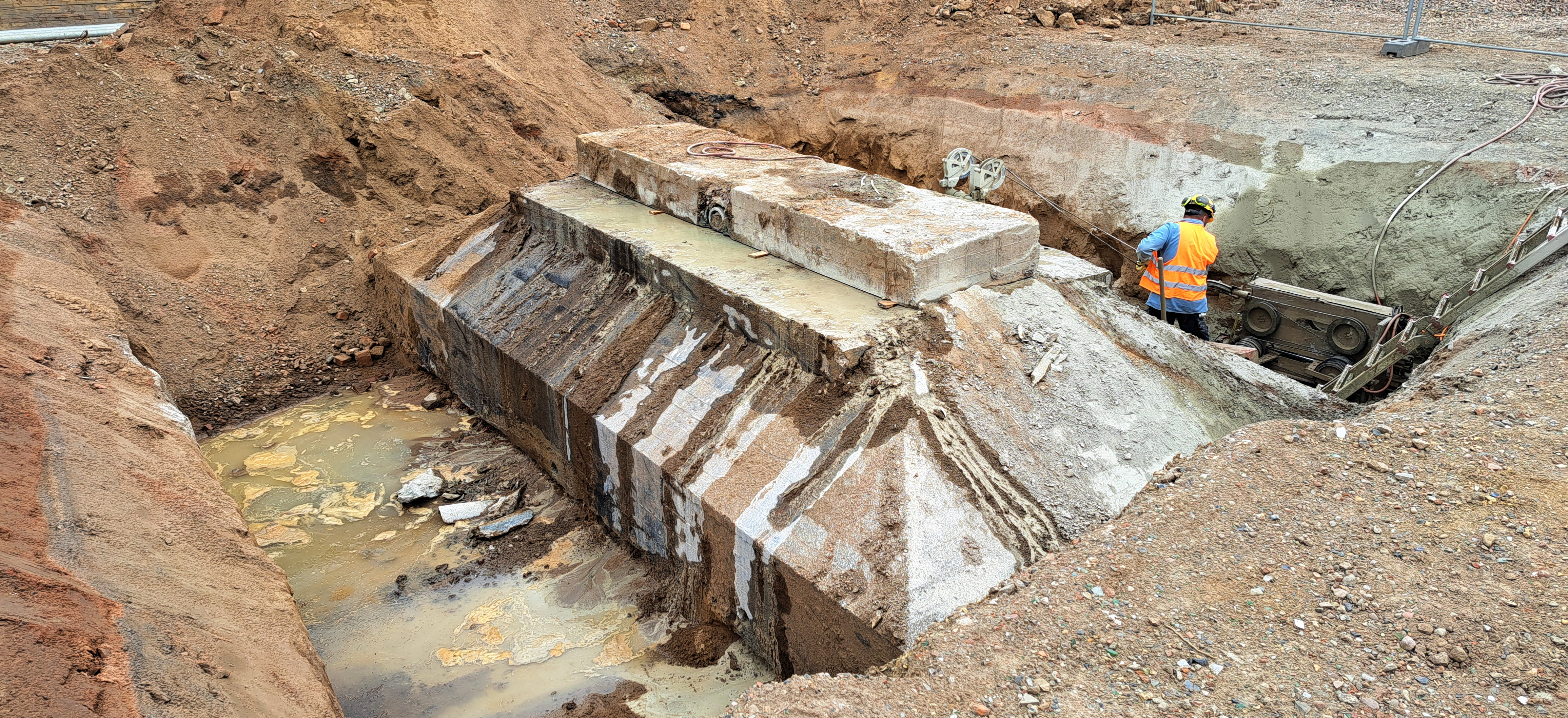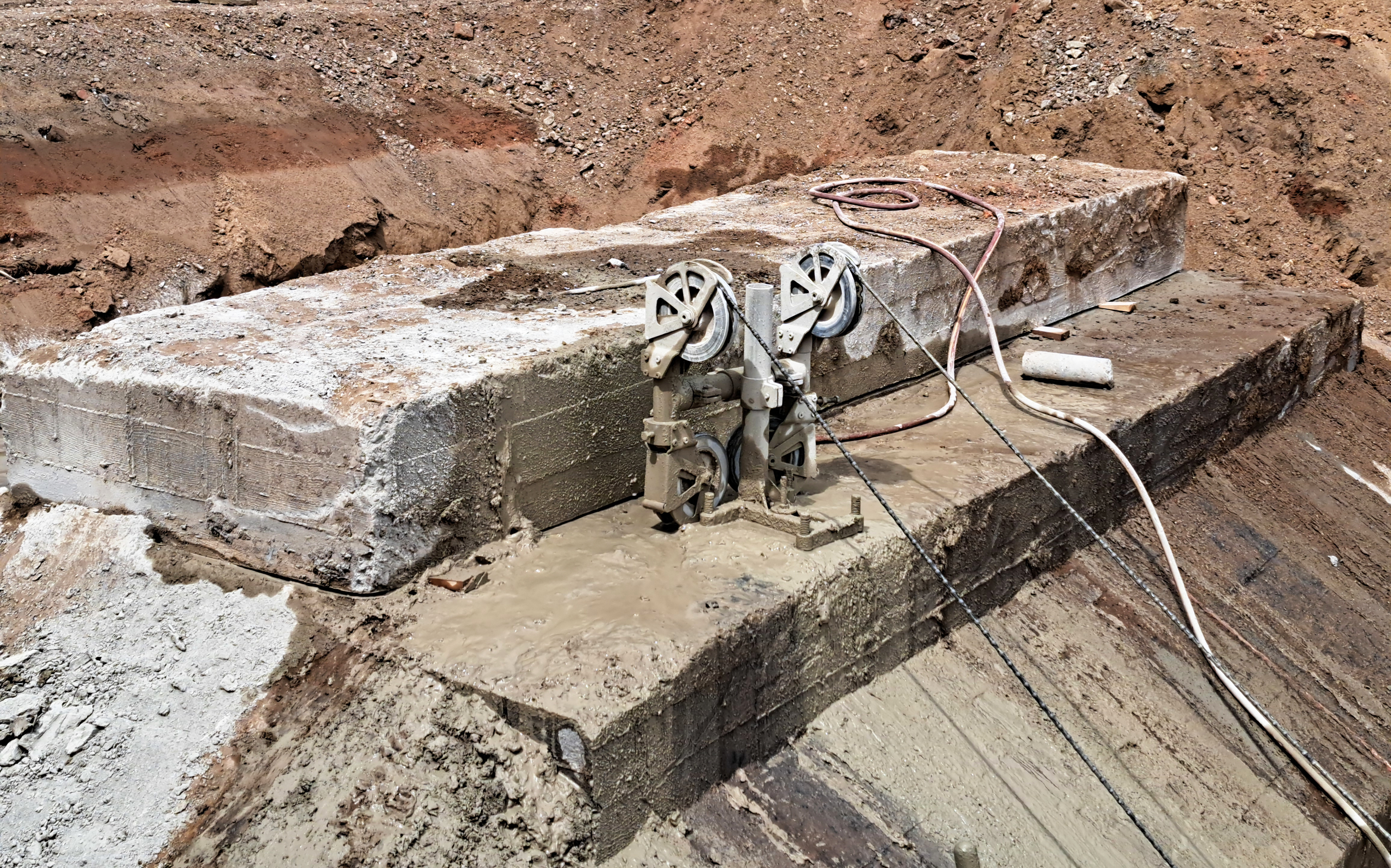 Das Motto hier ist also: nicht trümmern, sondern tranchieren. Dabei kommt ein Werkzeug zum Einsatz, das ganz einfach gestrickt ist – eine Seilsäge. Das Prinzip: Ein Motor treibt eine sehr widerständige Schlaufe an, die sich durch das Werkstück schneidet. Konkret handelt es sich um ein Stahlseil mit vielen „Knubbeln“ aus extrahartem oder diamantbesetztem Stahl – ähnlich einer Perlenkette. Das Seil läuft kontinuierlich um das Fundament, bis eine Scheibe abgetrennt ist. Die Fotos unten geben einen Eindruck. Anschließend werden die Scheiben ausgehoben und in kleine Teile zerlegt, die gut abtransportiert werden können.