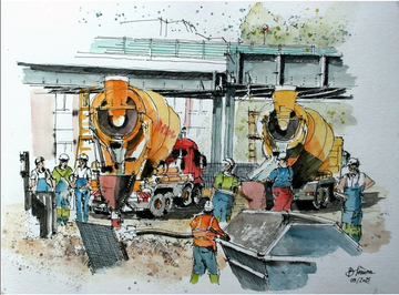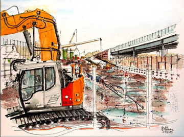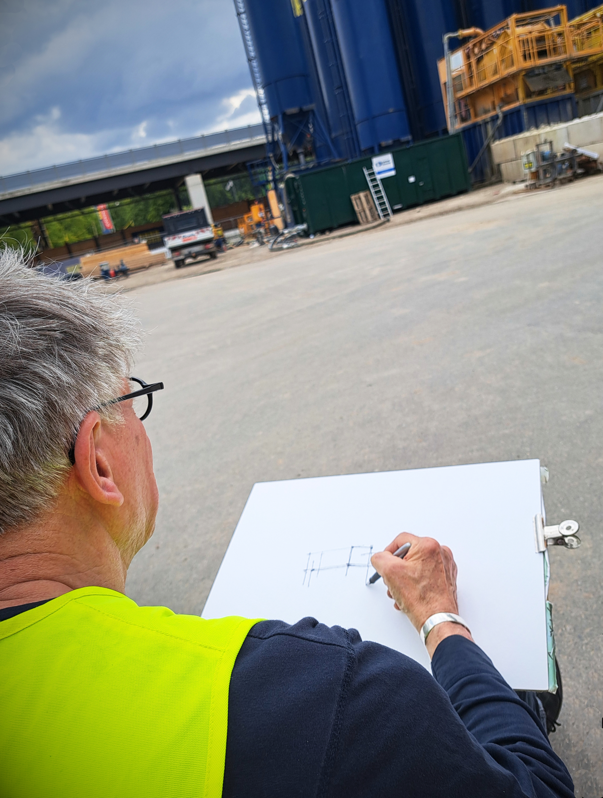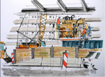 21 Bilder und Skizzen – in großem Format und in seinem Skizzenbuch – hat er vom Südschnellweg bisher geschaffen. Einige Stunden hat er dafür am Rande des Projektes verbracht. „Mittlerweile kenne ich schon ein paar Mitarbeiter“, schildert er. „Einige kommen vorbei, wenn sie mich sehen. Dann schauen sie mir über die Schulter, und wir unterhalten uns nett.“ Ein reger Austausch entstehe. Die Anderen freuten sich über die Bilder, er selbst lerne Details über das, was er gerade zeichnet. Eine Ehrenwarnweste habe er mittlerweile auch schon. „Während ich bisher nur außerhalb des Baufeldes bleibe, wünsche ich mir manchmal, mich zum Zeichnen und Malen noch näher am Geschehen aufhalten zu können, einen Helm habe ich noch im Büro“, sagt er.