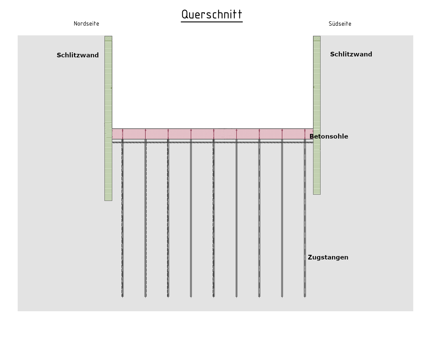 Richtig: Aus dem Boden, den wir bekommen, wenn wir uns in die passende Tiefe heruntergegraben haben. Also aus dem Boden der Baugrube, wenn sie einmal ausgehoben ist; und auf den in etwa 11 Metern Tiefe die Baugrubensohle angelegt wird. Das Schema unten gibt einen Eindruck, wie es (einschließlich Betonsohle) am Ende aussieht.