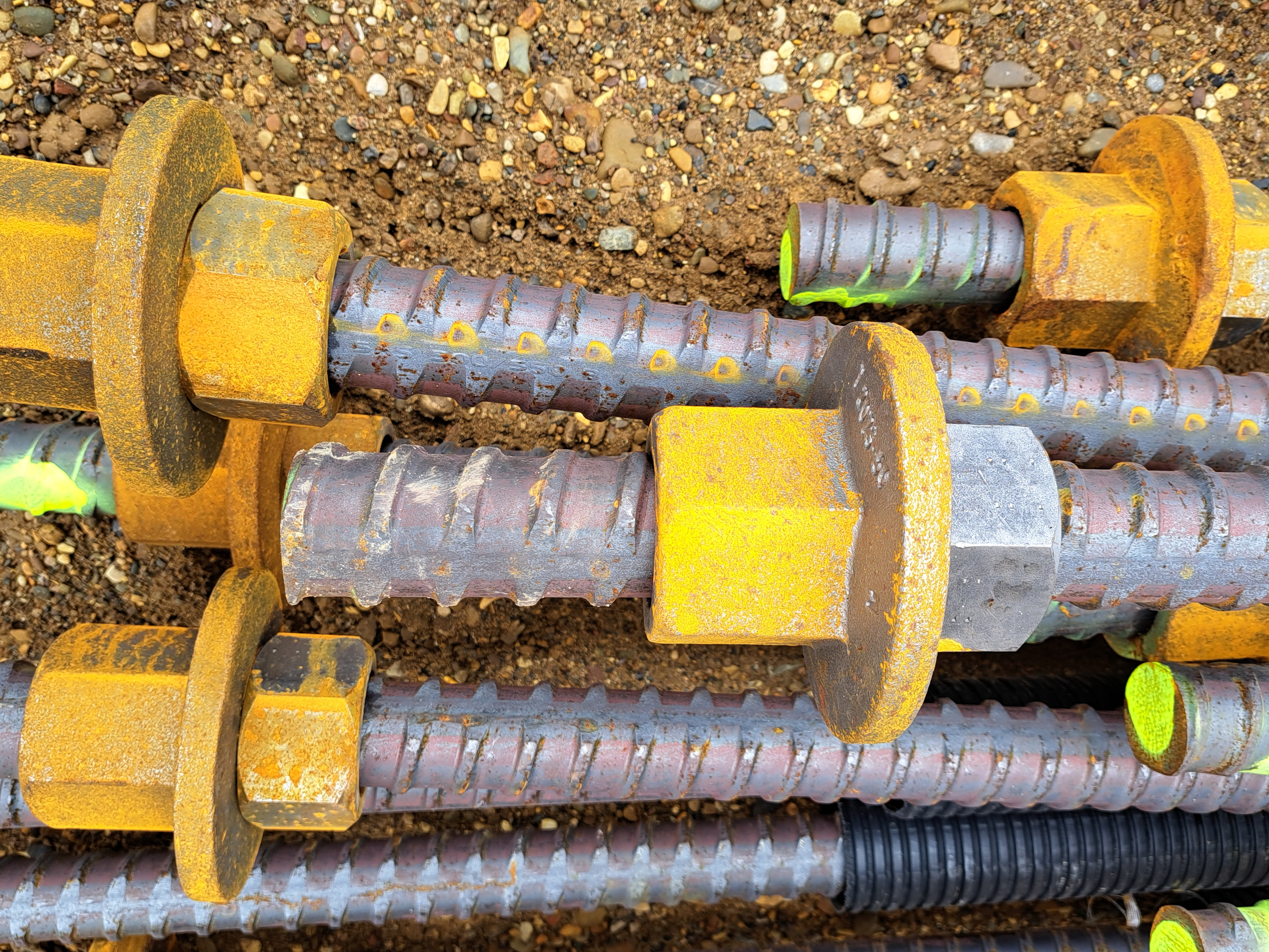 Wir bohren jetzt also reichlich Löcher – 128 Stück auf der Kreuzung Hildesheimer Straße – füllen Zementsuspension ein und lassen diese langen Stahlstangen dort hineinplumpsen. Später graben wir den Boden ab. Und wenn die Baugrube ausgehoben ist, liegt dort unten ein Feld mit anderthalb Meter langen Stoppeln – die oberen Enden unserer Zugstangen. Auf diese Stoppeln schrauben Spezialisten dann Ankerstücke (auf dem Foto unten zu sehen) und sichern diese mit Kontermuttern. Über alle sechs betroffenen Baudocks gesehen, werden es am Ende mehr als 2.000 Zugstangen sein.