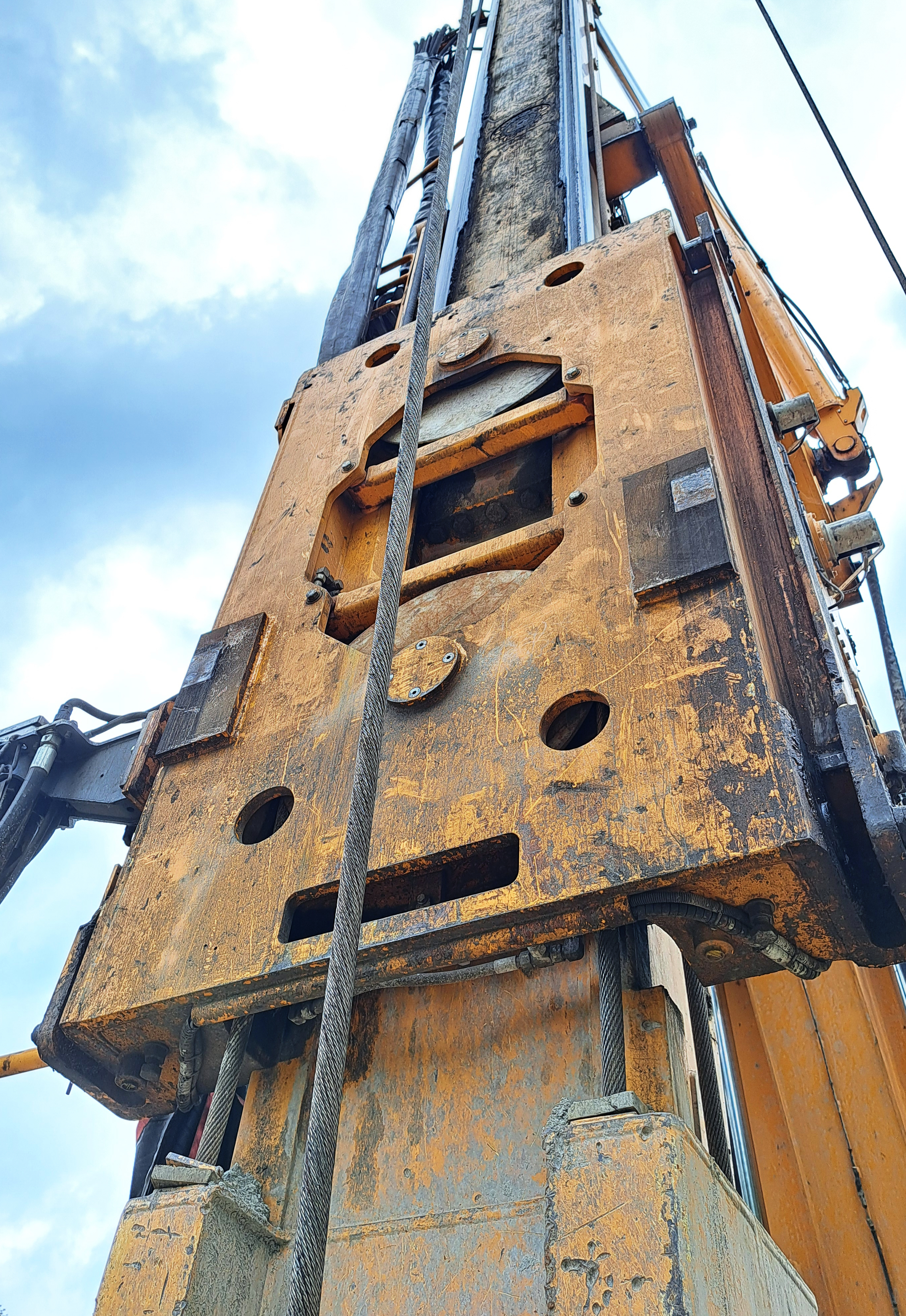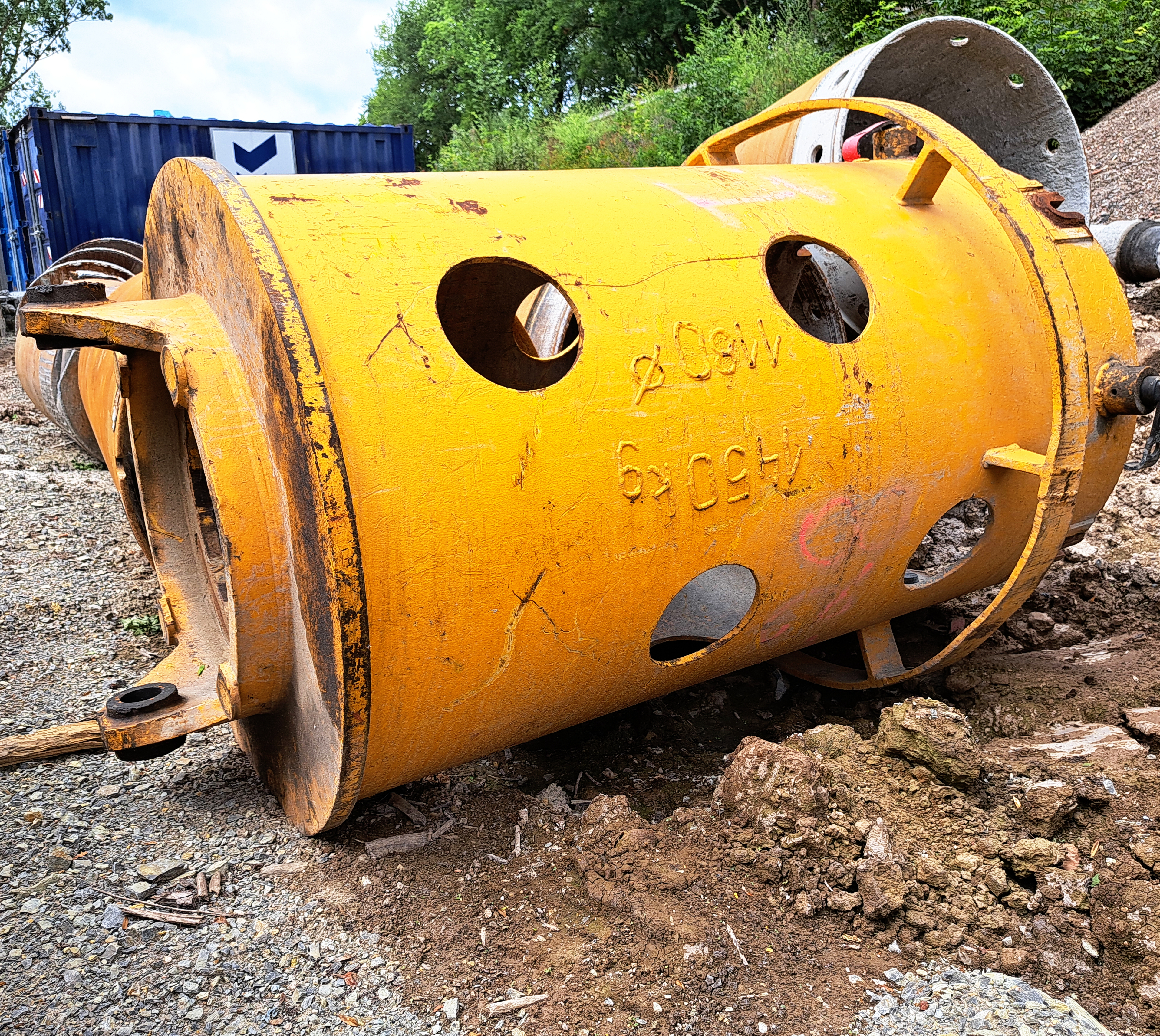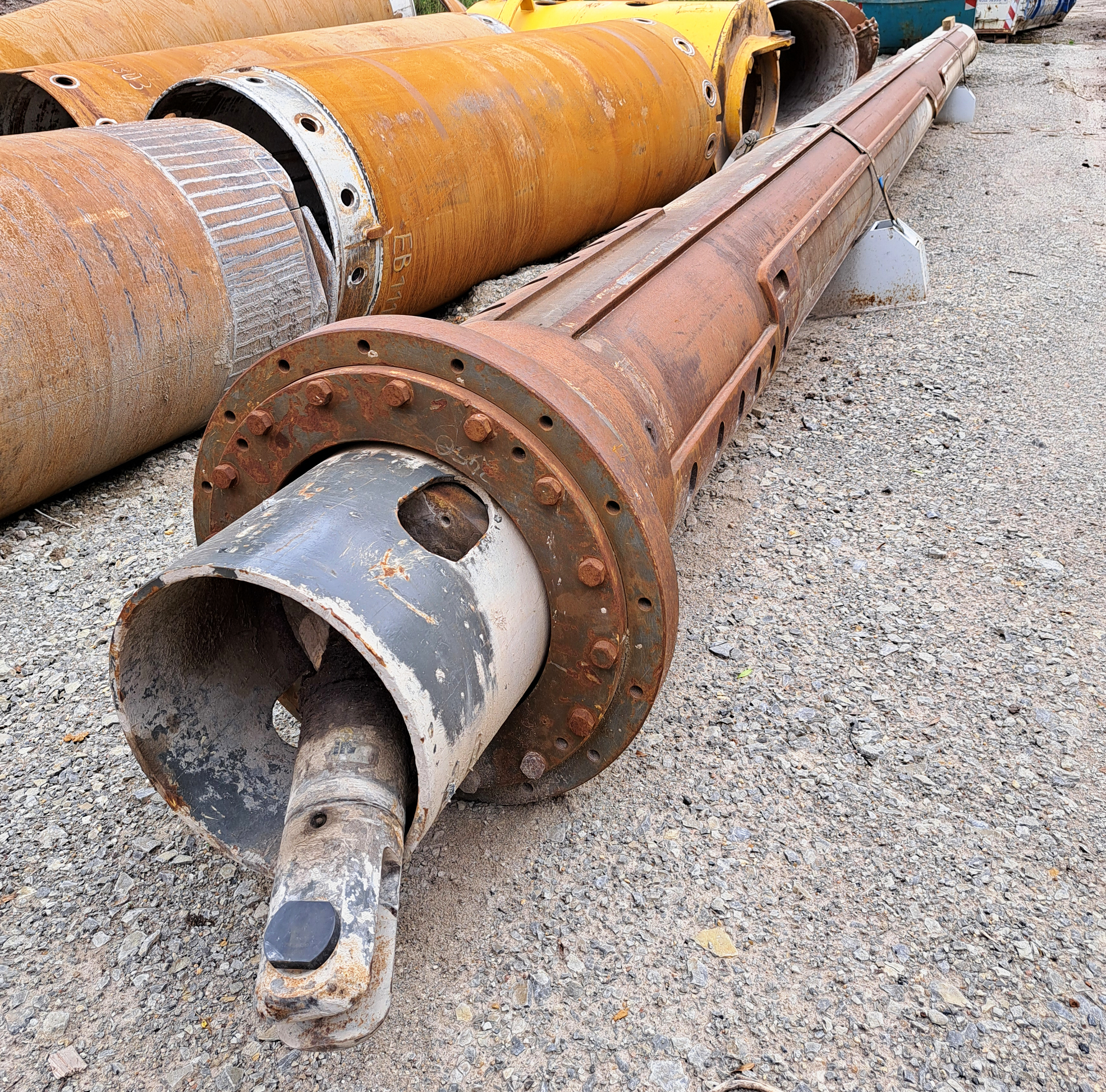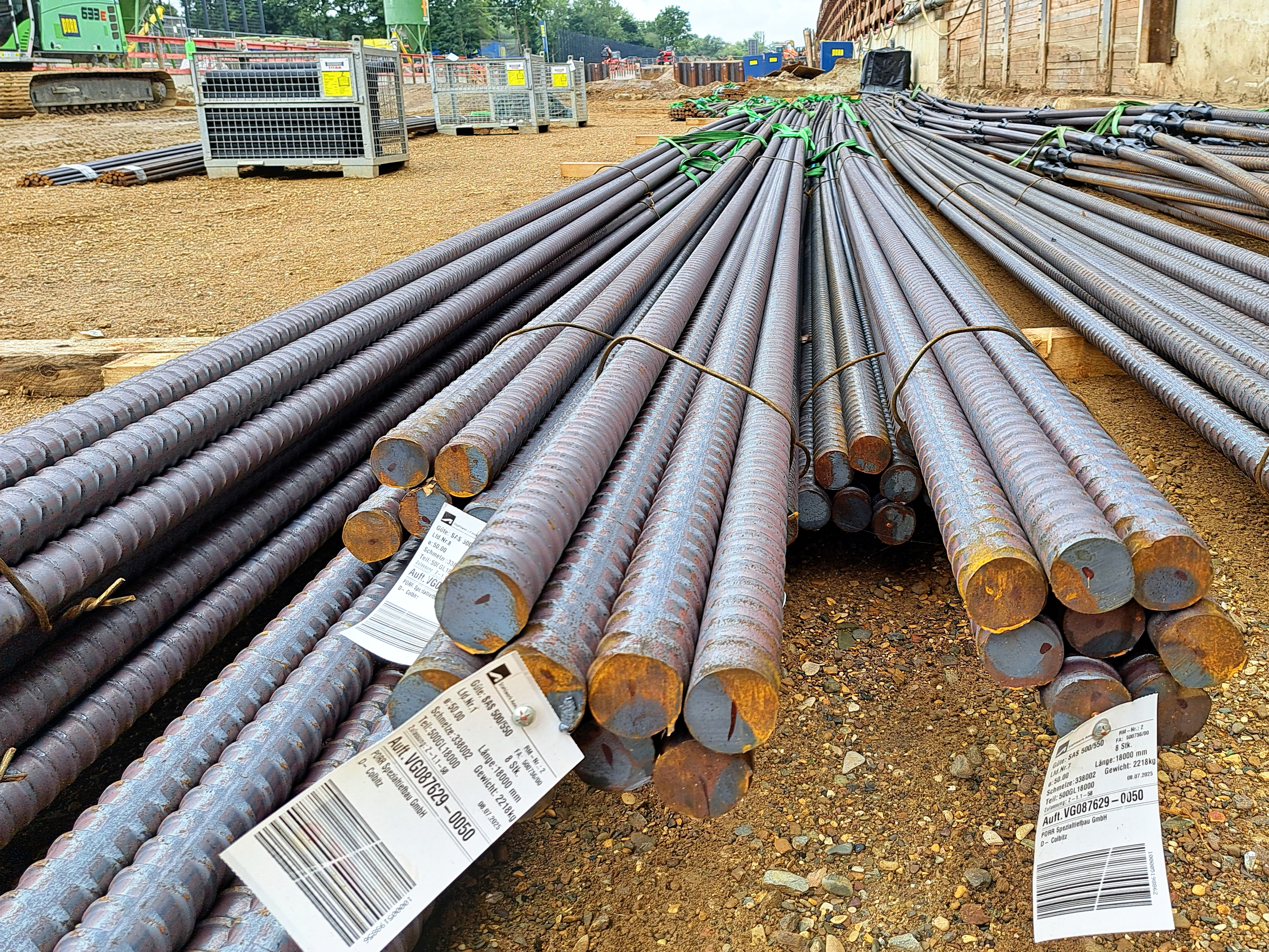 Dass auch beim Arbeitsablauf ein Ende immer auch ein Anfang ist, zeigt sich dort ebenfalls. Kaum ist das Erdreich weggeschafft, liegen dort die Bauteile für den nächsten Schritt. Meterweise Großgestänge, um damit die Bohrpfähle in die Tiefe zu treiben.