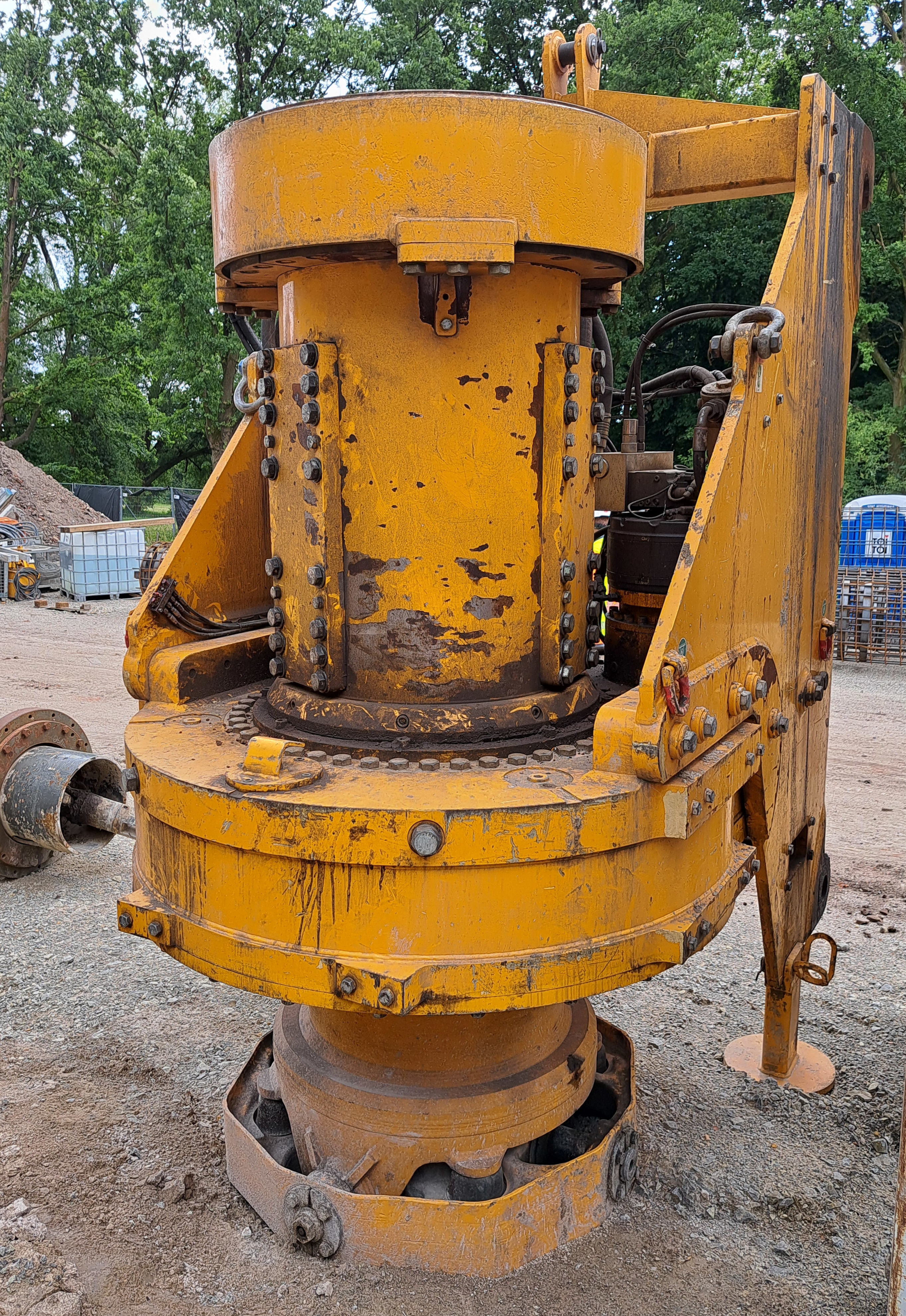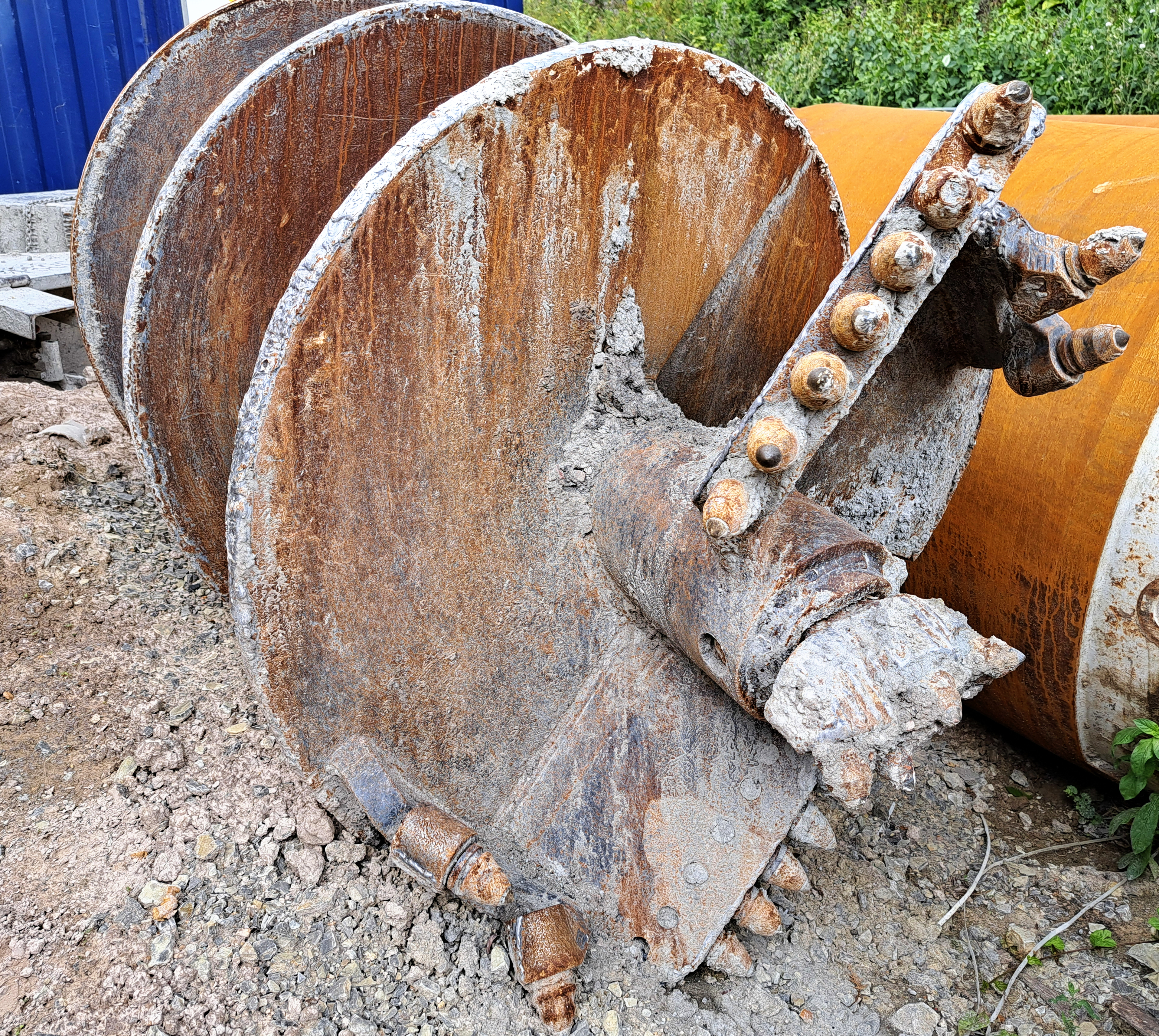 Die Lösung: mit einem Pfahlfußaufschneider. Das ist ein Werkzeug mit einer robusten Mechanik. Die Drehwelle (Kellystange) drückt dabei von oben und klappt dadurch ein paar seitliche Schneidemesser aus. Die rotieren dann im Bohrloch und schneiden einen Kegelstumpf in die Seitenwände, bis die gewünschte Breite erreicht ist.