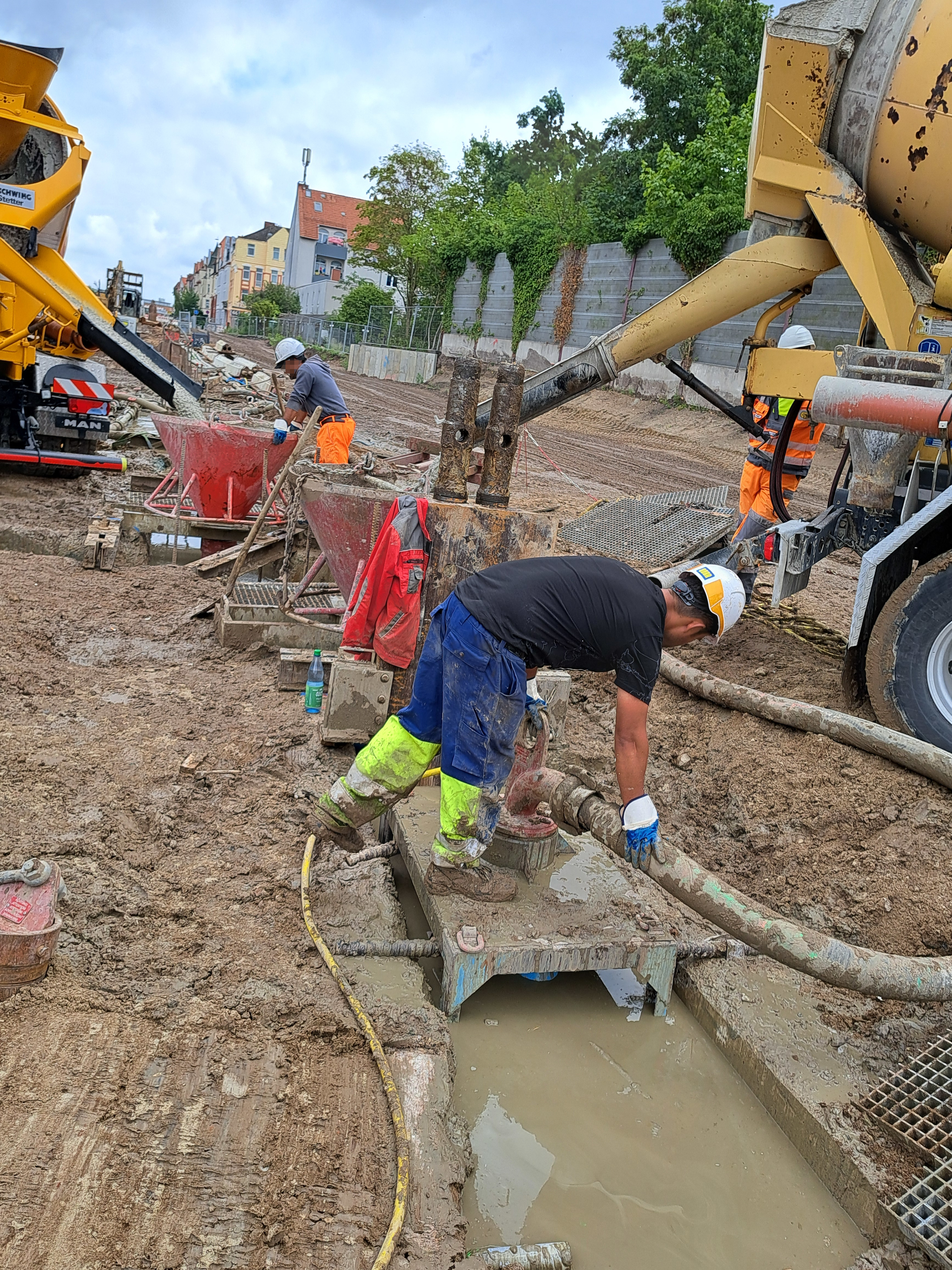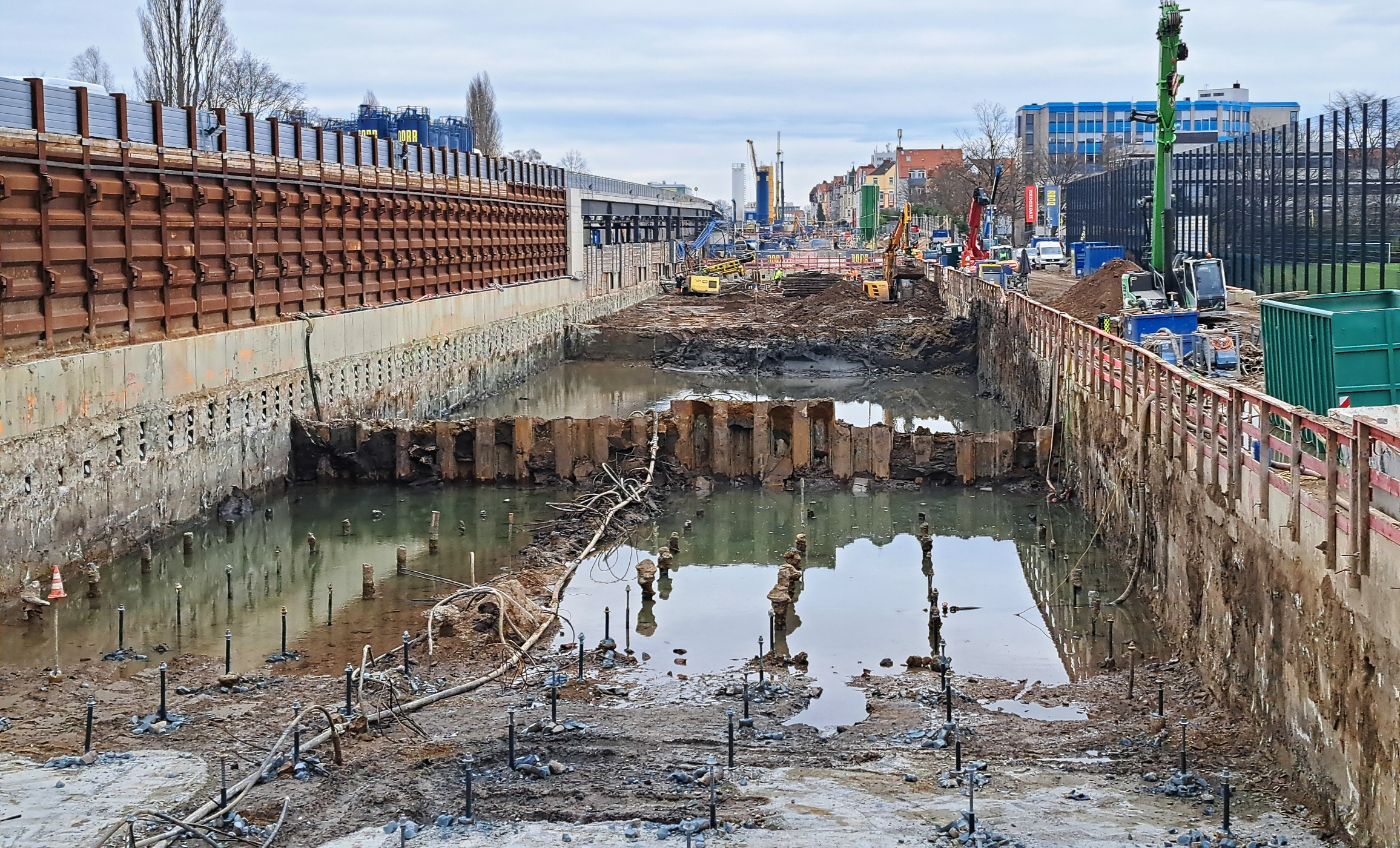 Nicht alle Docks werden aber so tief gegraben. Ihr Fußboden entsteht mitten im Grundwasserbereich. Also müssen wir ihn so bauen, dass er wasserdicht ist und das Baudock trocken (und stabil) hält. Paradox erscheint, dass wir diesen Fußboden dann bauen, wenn Wasser im Dock steht. Die Sohle wird also unter Wasser betoniert. Klingt spannend? Ist es auch. Deswegen erklären wir das später noch genau, wenn es soweit ist. Nur soviel kurz vorab: Diese Abdichtung nach unten hat zur Folge, dass wir grundwasserschonend bauen. Denn wäre die Grube unten offen, müsste das Grundwasser in halb Döhren abgesenkt werden. So aber bleibt das Wasser rundherum im Untergrund erhalten und nimmt weiter seinen natürlichen Weg.
